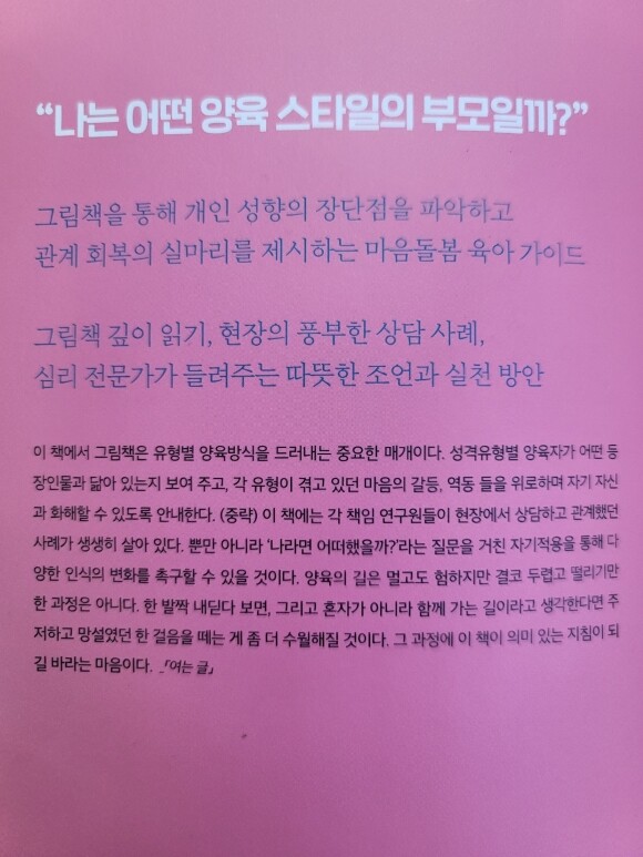 일반적인 양육태도나 성향에 대한 분석과 아이를 키우면서 멀리할수 없는 그림책에 대한 소개양육에 대한 위로와 공감! 나에게 들려주면 좋은말로 완벽한 솔루션까지 제공해주어서