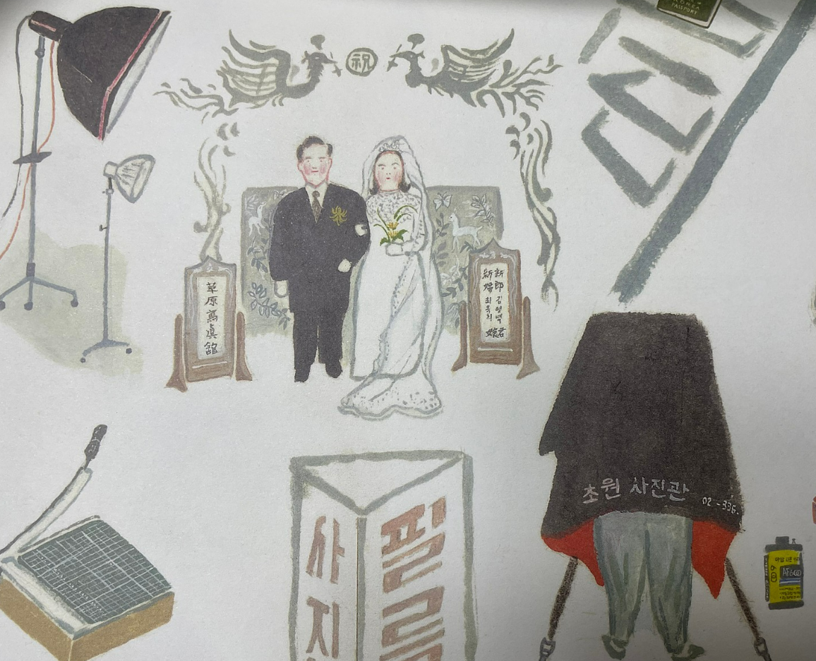 그 다음은 사진관 아저씨! 역시 뒷모습이시네요^^ 제게 초원사진관은 8월의 크리스마스로 연결되는데, 그 시대에 초원 사진관이라는 이름 또한 흔하지 않았을까요. 저희 부모님 사진에서나 보던 배경으로 결혼 사진을 찍는 주인공들.. 필름 간판, 제단기