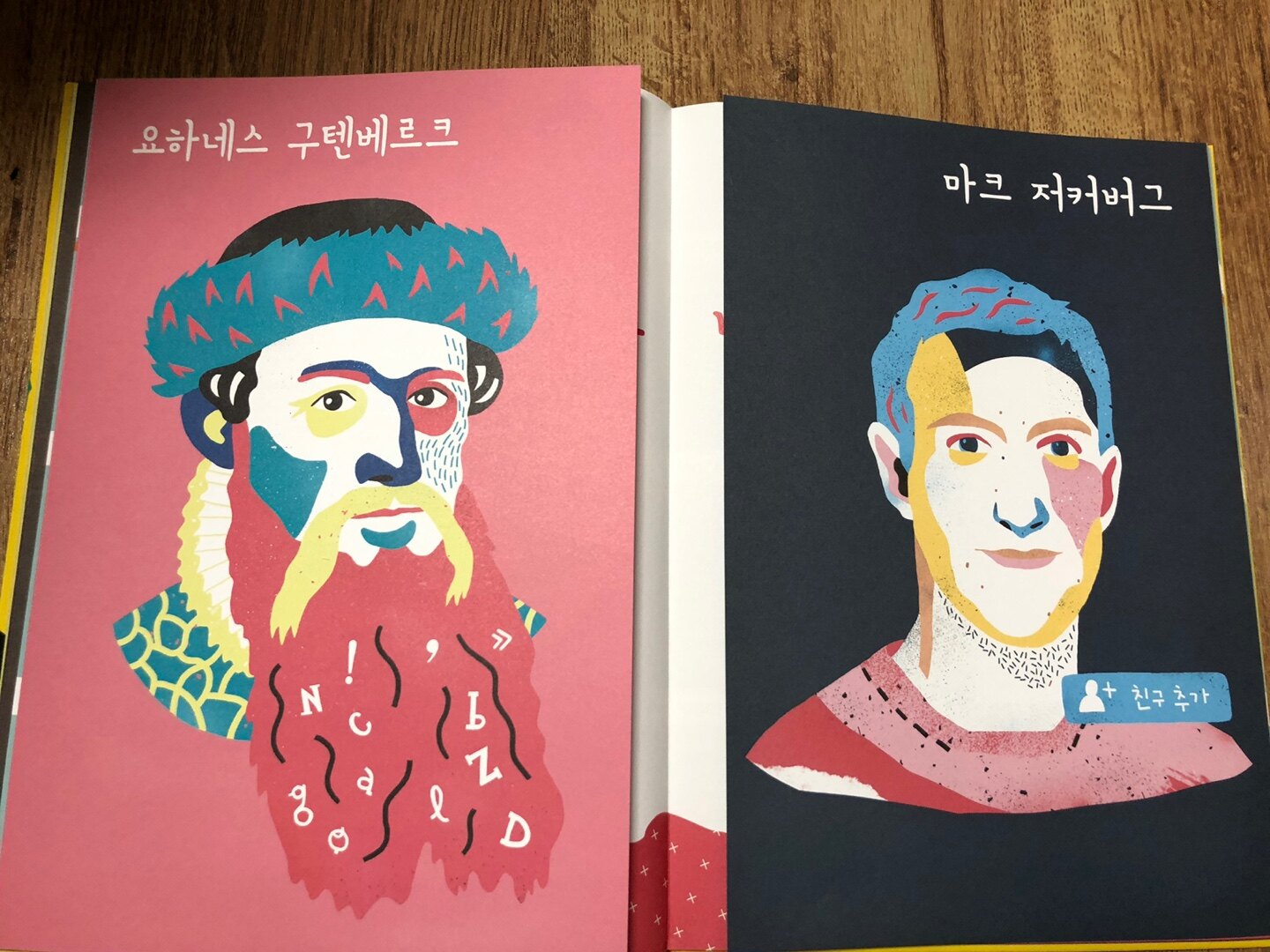 일러스트 속 인물들이 특징만 쏙 뽑아 꼭 닮았죠?^^ 게다 인쇄술을 발명한 쿠텐베르그의 수염에는 활자들이^^ 그리고 페북 창시자 저커버그에게는 친구추가 이모티콘과 함께하는 센스라니~! 다른 인물들에는 어떤 디테일이 숨어있을지 찾아보는 재미도 있습니다.