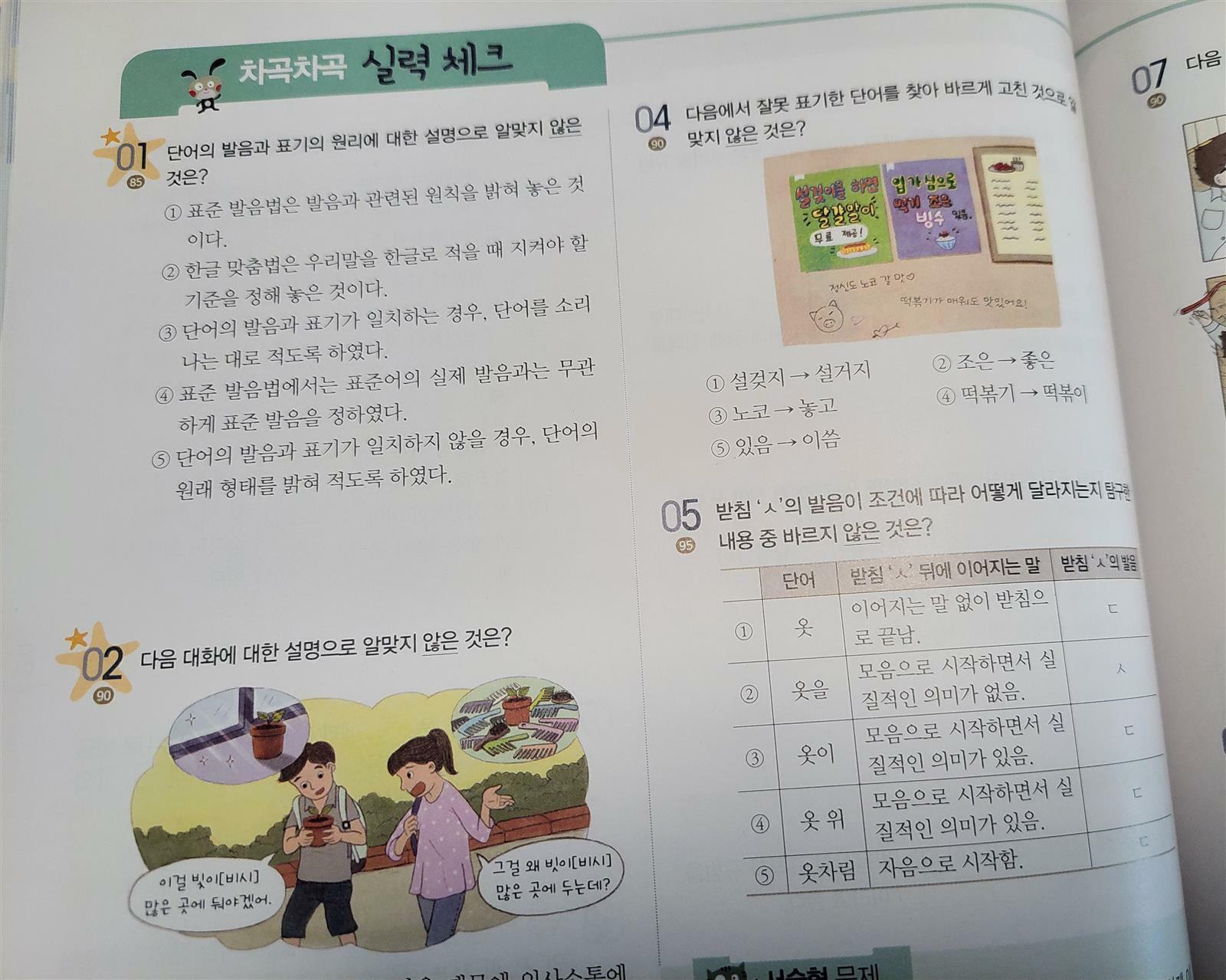 9종 국어 교과서의 지문과 쉽고 적합한 예시만을 엄선하여 '문학, 읽기, 문법, 듣기. 말하기, 쓰기'의 개정 교육과정의 5개 영역을 고루 익힐 수 있게 구성되어 있어요. 어떤 영역의 문제를 만나도 자신 있게 푸는 실력을 기를 수 있습니다.