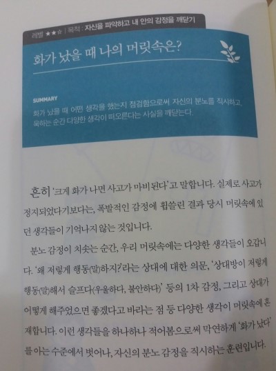 어른들의 마음공부에 이어 아이들의 마음공부를 위해 눈높이에 맞춰 설명이 잘 되어 있고(마음속 컵에 담긴 다양한 감정을 인식하기, 반사적으로 욱하지 않기 위해 6초동안 참아보는 연습하기, 나에 대한 다른 사람의 시각을 들어봄으로써 사람마다 다르다는 조망수용능력 기르기, 내가 화내는 패턴 찾기, 감정의 강도 인식하기, 화가 났을 때 내 머릿 속 들여다 보기 등등), 이러한 시간들은 아이가 자신의 감정에 상처를 받지 않고, 스스로 자존감이 높으며, 행복하게 타인과 관계 맺고 행복할 수 있도록 해줄 것이다. 다시금 강조해도 모자라지 않는 이 책은 부모공부를 위해 꼭 필요한 책이고, 자녀의 마음건강한 성장을 위해 꼭 필요한 책이다.