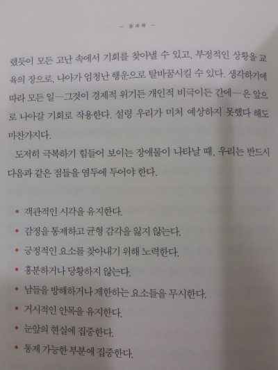이 책을 읽는 내내 들었던 생각은 '돌파력'을 위해 가장 중요한 건, 첫 단계인 것 같다는 생각이었다. 무조건 문제를 거대한 어둠, 실체 없는 공포라고 생각하고 '좌절'을 지레짐작 먼저하는 게 아니라, 현재 내가 빠진 상황을 객관적으로 인식하고, 제한된 요소보다는 통제 가능/변화가능한 부분에 초첨을 맞춰야 하는 일이라고 우선되어야 한다고 생각한다. 여기서부터가 시작인 것이다. '변화가능한 부분'/'내가 할 수 있는 일'/'거시적인 안목에서 긍정적인 요소 찾기'가 우리를 더 높은 단계로의 성장을 위한 실행의 길로 이끌어 줄 것이라 생각한다.