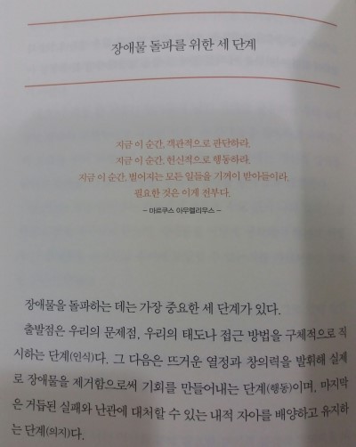 장애물을 만났다면, 이 책을 읽어보자. 어떤 상황에서도 기회를 발견하고 행동을 준비할 수 있는 능력, 실패를 출발점으로 삼아 앞으로의 과정에 포커스를 맞추는 일, 의연하게 내게 일어나는 모든 일을 진심으로 사랑하고, 장애물을 '새로운 길'로 바꿀 수 있는 힘(돌파력)이 필요함을 깨닫게 되어, 스스로의 운명을 바꿀 수 있다는 통찰 자체를 내 인생에서 전환점 도구로 활용할 수 있게 될 것이다.