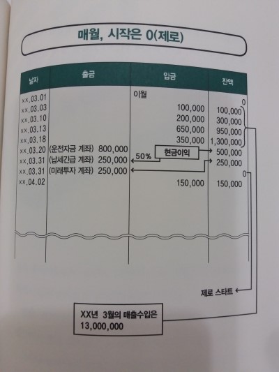 말 그대로 간단하다. 회사 입장으로 설명한다면, 매출, 즉 들어오는 돈은 입금계좌(초록색), 회사운용에 필요한 비용들은 운전계좌(노란색), 기업등에서 지출로 나가게 되는 세금을 따로 떼어 저축하는 납세계좌(빨간색), 미래전망을 보고 회사의 꿈을 위한 투자자금인 투자계좌(파란색)로 각각 나누어 관리함으로써 돈의 흐름을 '정확히' 인식하고, 정형화시키며(패턴을 보며), 정기적으로 확인 및 앞으로의 계획을 세워 관리하는 것이 반드시 필요하다는 것이다.