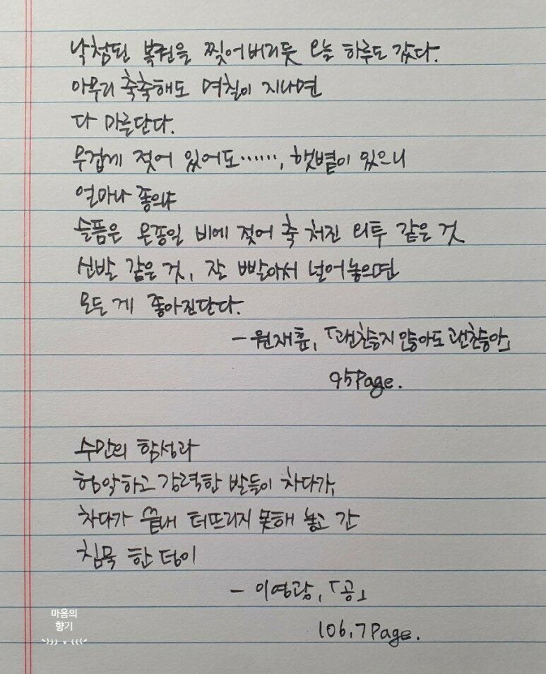 시인의 마음은 이런 거라고 보여주는 문장들이 마음에 닿아서 저도 모르게 펜을 들어 옥스포드 노트에 옮겨 적고 있더군요. 적다보니 발췌라기엔 너무 많아졌지만, 외에도 좋은 구절은 차고 넘치니 이정도 쯤은 괜찮다고 생각하렵니다.