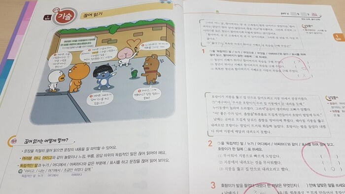기본적으로 끊어읽기는 어떻게 하는 것이고 무엇인지에 대해 알려주고 앞서 배운 문해기술을 이용해 문제를 풀어 보는 형식이랍니다