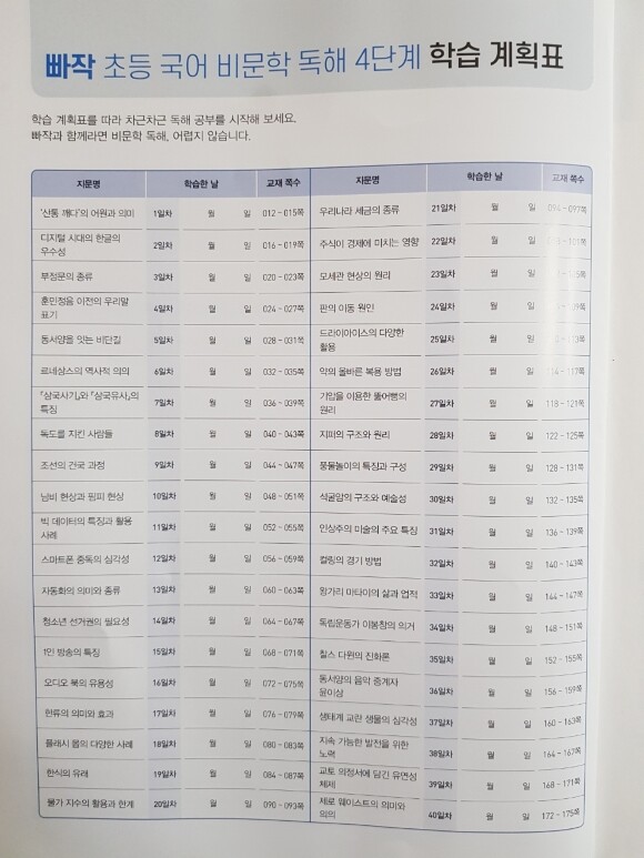 비문학 글은 지식이나 정보 글의 특성이 있기 때문에 핵심 주제, 글쓴이의 관점 등을 이해하며 읽는 훈련을 해야 하고, 문학 작품의 경우는 갈래에 따라 작품을 구성하는 요소가 다르기 때문에 갈래별 특징을 이해하고 작품을 감상하는 것이 중요하죠. 때문에 빠작 초등 국어는 비문학과 문학을 분리하여 문제집을 구성했다고 하더라고요.