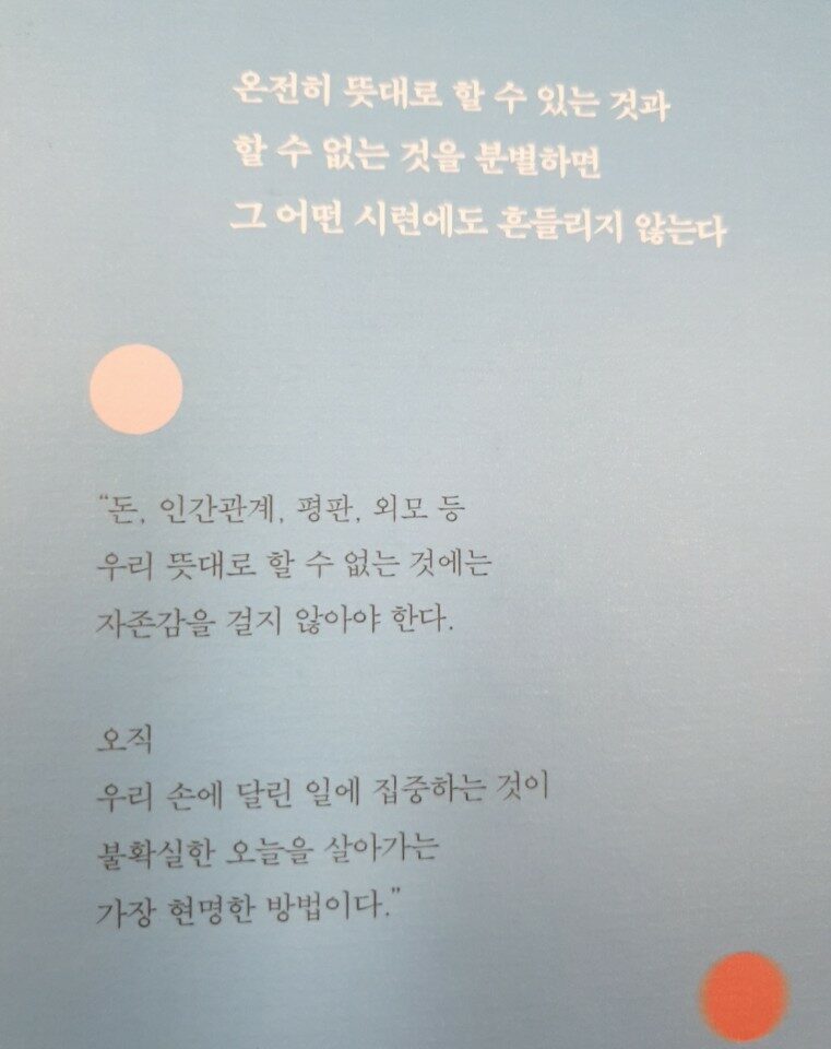 - 온전하게 우리에게 달려 있는 것에 집중하기 (판단, 의견, 목표, 가치관 그리고 결심), 48~49 P