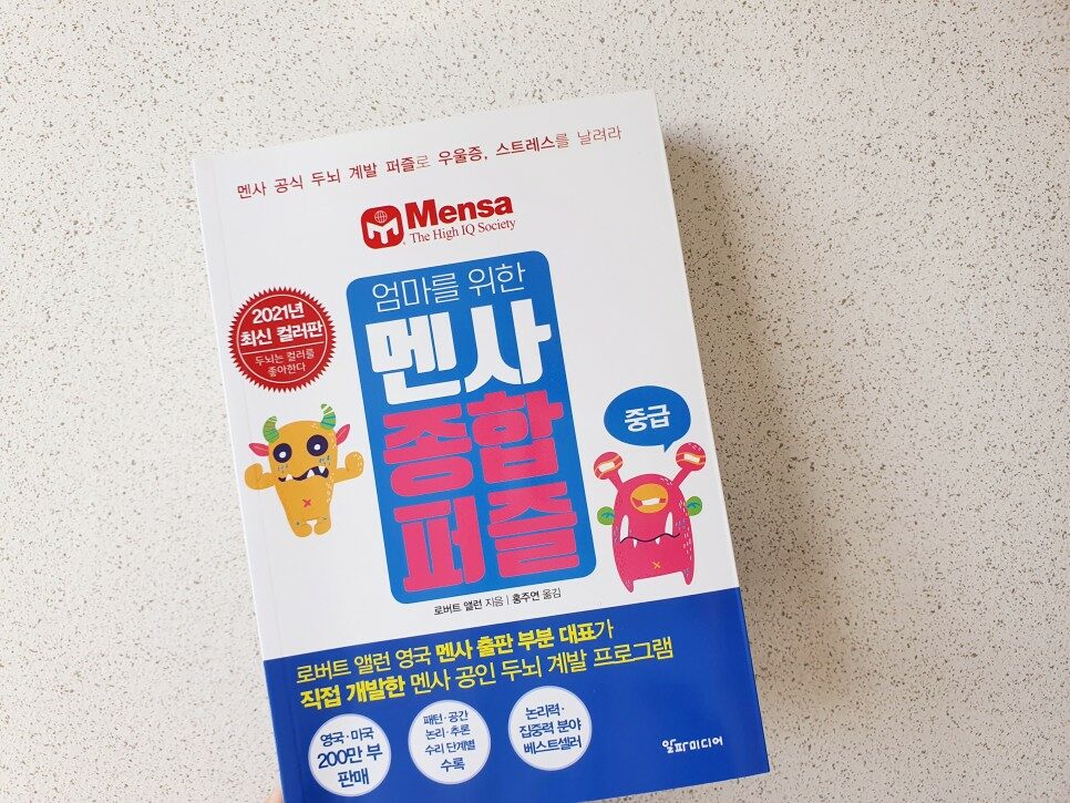집에 멘사 퍼즐이 많이 있지만 아이들을 위한 퍼즐 위주였는데 이번에 엄마를 위한 퍼즐이 나왔다니 반갑네요. 저도 굳어가는 두뇌에 자극을 줘야겠죠. 책 표지에 보니 '멘사 공식 두뇌 계발 퍼즐로 우울증, 스트레스를 날려라'라는 문구가 보이네요. 이런 새로운 문제를 풀면서 주부 우울증이나 코로나 스트레스를 풀면 좋겠네요.