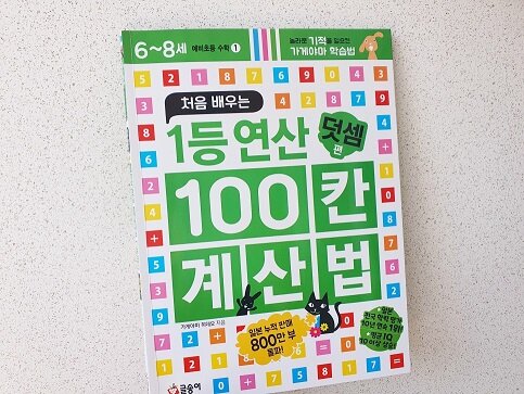 가게야마 학습법으로 유명한 예비초등 수학 시리즈입니다. 이 책은 6권 중 1권인데요. '처음 배우는 1등 연산 100칸 계산법 덧셈 편'입니다.