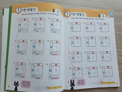 제목이 100칸 계산법이라서 어렵지 않을까 걱정했는데 단계별로 잘 나와있더라고요. 처음에는 1칸 덧셈 문제를 풀고 그다음에는 5칸 덧셈, 10칸 덧셈, 30칸 덧셈, 50칸 덧셈을 거쳐 100칸 덧셈을 풀게 됩니다. 처음부터 끝까지 (한 자릿수)+(한 자릿수)를 푸는 문제라 어렵지 않아요. 푸는 방법도 상세하게 나와있어서 아이 혼자 풀기에도 괜찮습니다. 연산은 반복이 중요하다고 하잖아요. 이 문제집은 반복 학습에 중점을 둬서 빠르고 정확하게 푸는 것을 목표로 하고 있습니다. 아이가 문제집을 보더니 바로 가져가서 매일 조금씩 풀고 있어요. 문제 수가 적당하고 유형만 다르게 반복되는 수준이라 쉽게 푸네요.