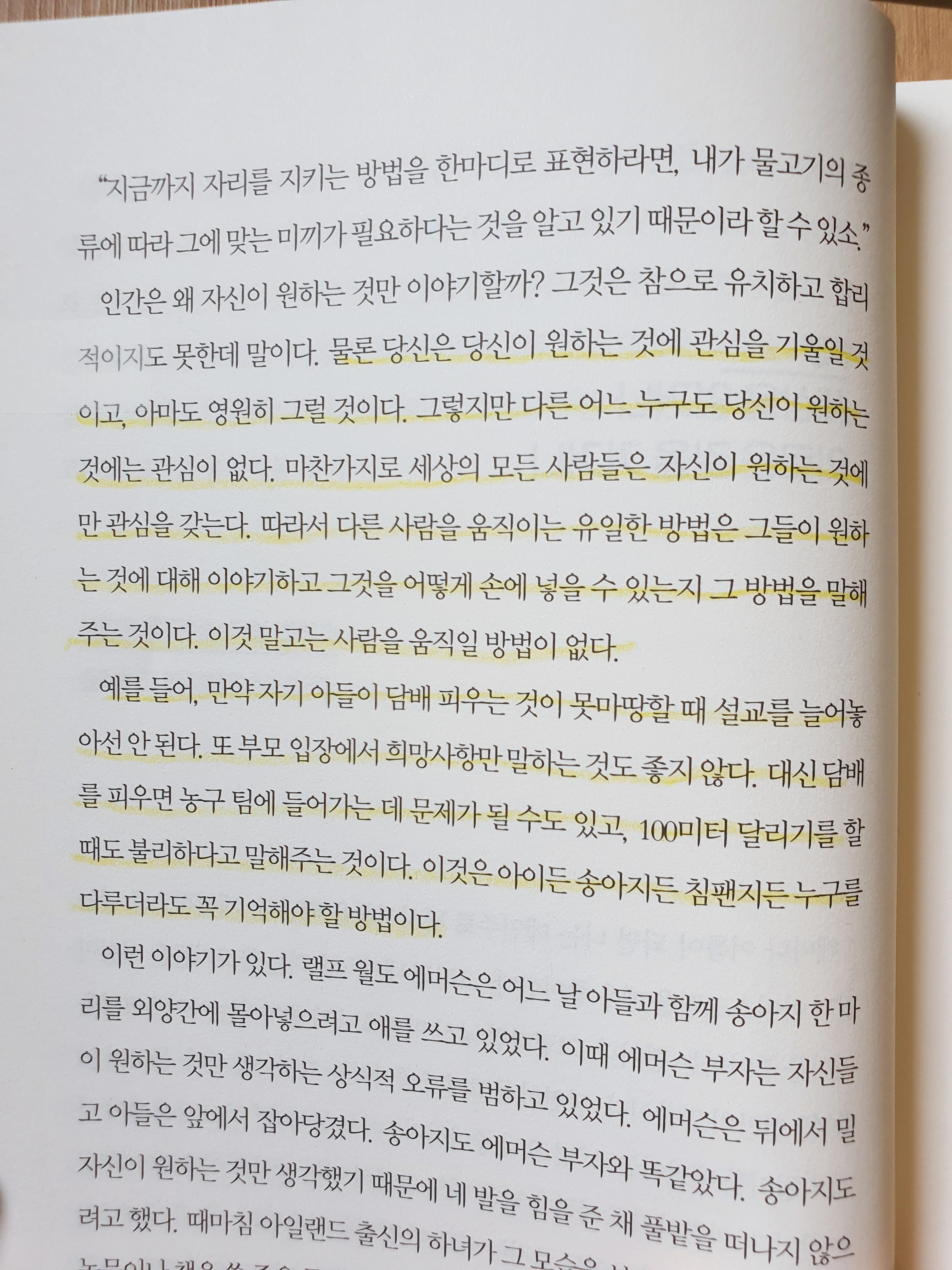 물건을 파는 세일즈를 하거나 중요한 계약을 따낼 때에도 이 법칙은 한결같이 통합니다. <데일 카네기 인간관계론>의 관통하는 이 내용은 책의 전반에 걸쳐서 반복적으로 드러납니다. 수많은 갈등 사례와 그것을 성공적으로 풀어낸 사례들이 등장하는데요. 하나의 예를 들어 그 핵심을 들여다보면 이렇습니다.