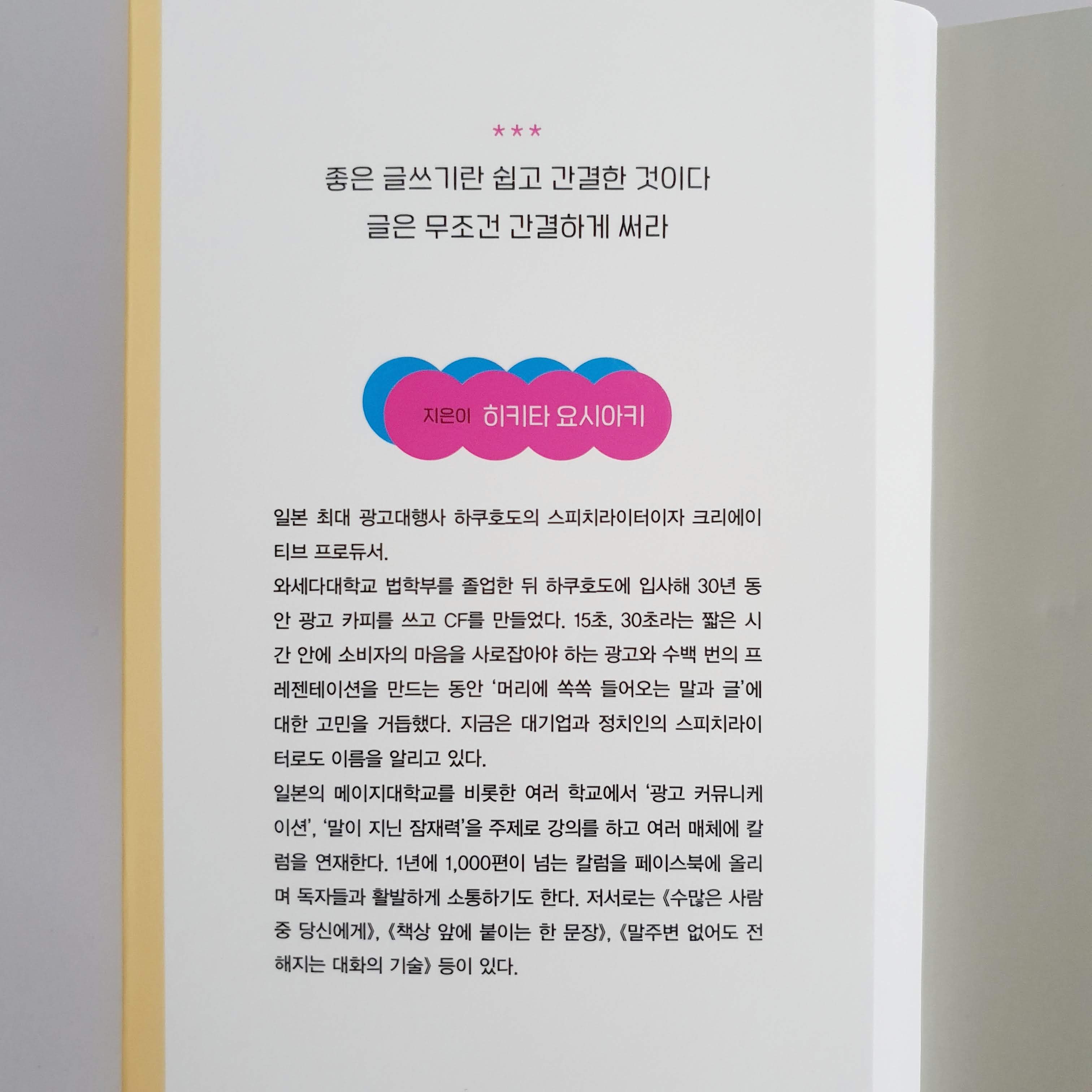 <짧은 글을 씁니다>의 저자는 히키타 요시아키라는 사람으로 일본 최대 광고대행사 하쿠호도의 스피치 라이터이자 크리에이티브 프로듀서로 활동하신다고 하네요. 30년 동안이나 광고 카피를 쓰고 CF를 만들어왔다고 합니다. 1년에 1000편이 넘는 칼럼을 페이스북에 올리고 저서도 여러 가지가 있는 작가입니다.