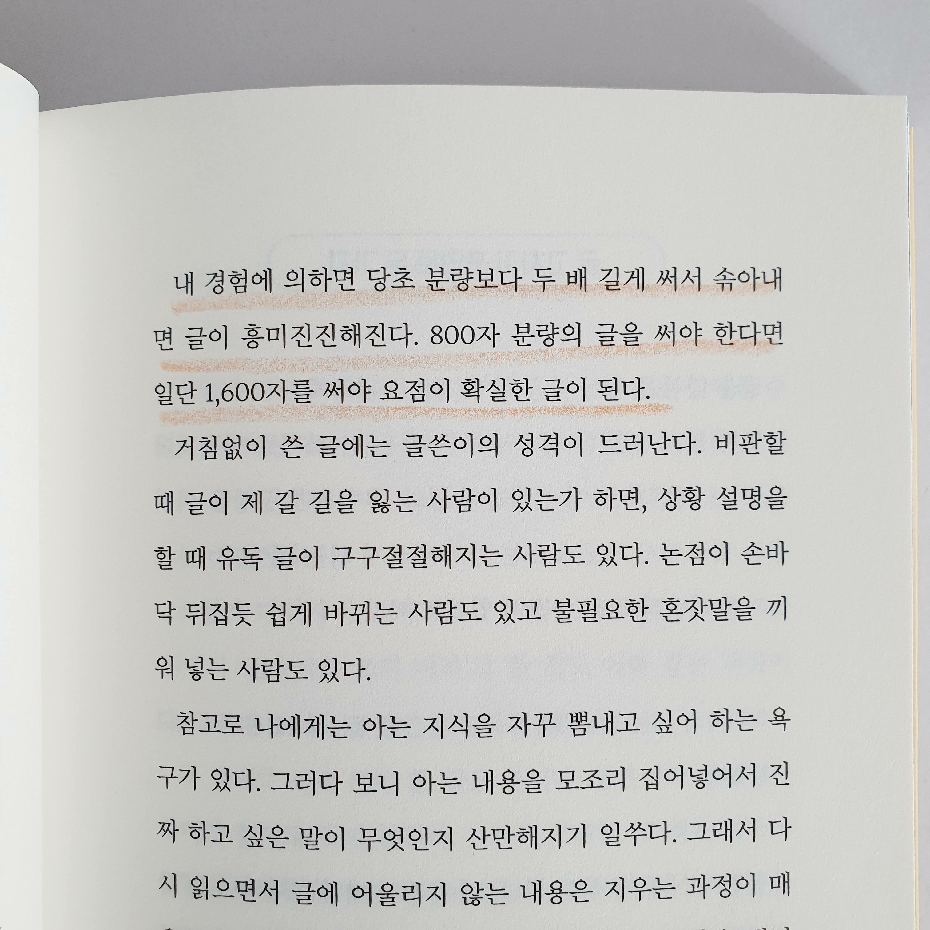 책의 구성을 살펴보자면, 글을 요약할 수 있는 능력을 길러야 요약된 글을 쓸 수 있다는 이야기로 시작합니다. 그 후로는 글의 골격을 마련하고 실제 쓰고 나서 읽어봐야 한다는 등 다양한 글쓰기의 요령들이 등장합니다. 제가 아는 내용도 있었고 모르는 내용도 있었어요. 여러분께 도움이 될만한 요령 3가지를 소개해보겠습니다.