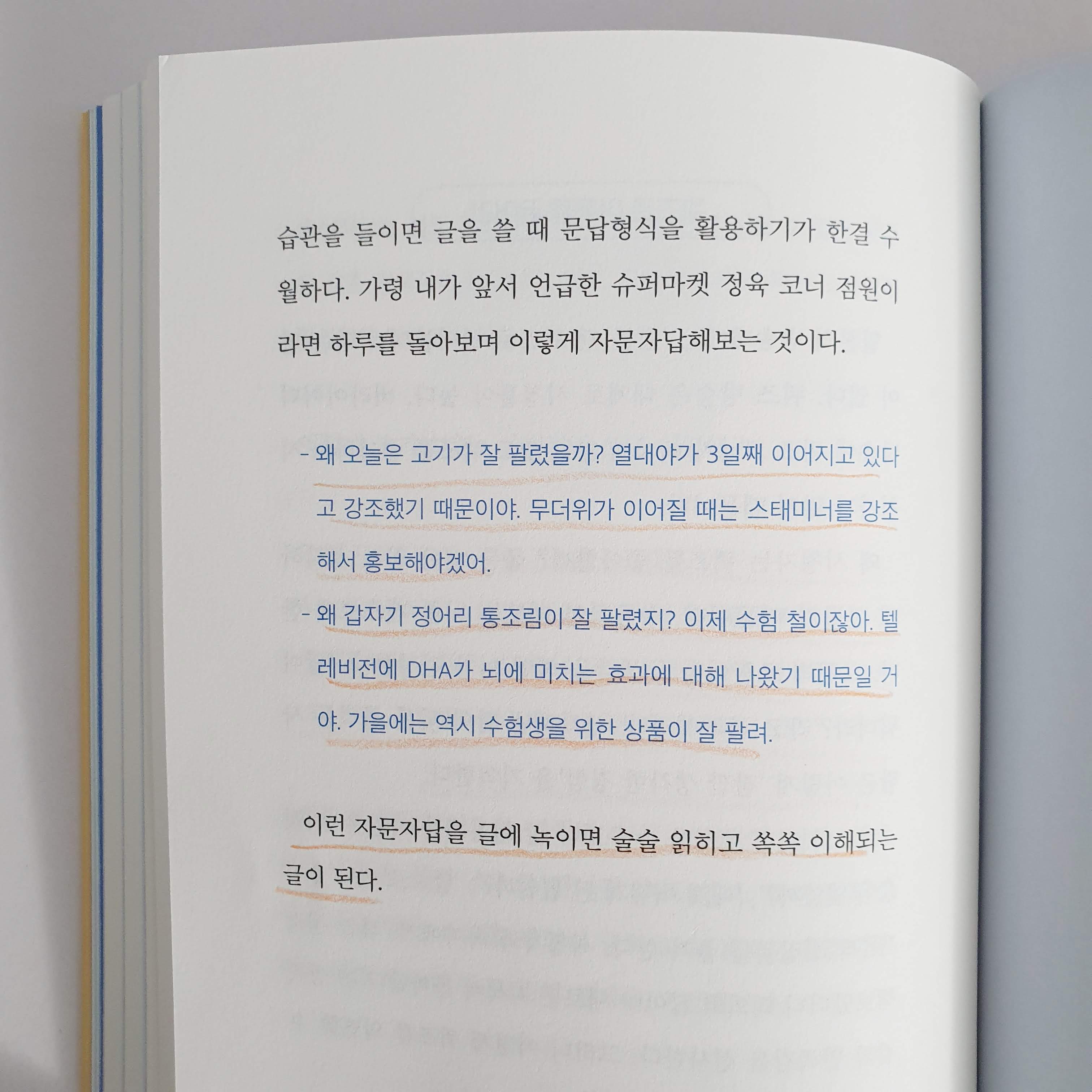 세 번째는 자문자답 형식의 글을 쓰라는 것입니다. 강의를 잘 하거나 말을 잘 하는 사람의 이야기를 들어보면, 질문과 대답을 적절히 사용해가면서 청중의 관심을 이끌어간다는 것을 알 수 있습니다.