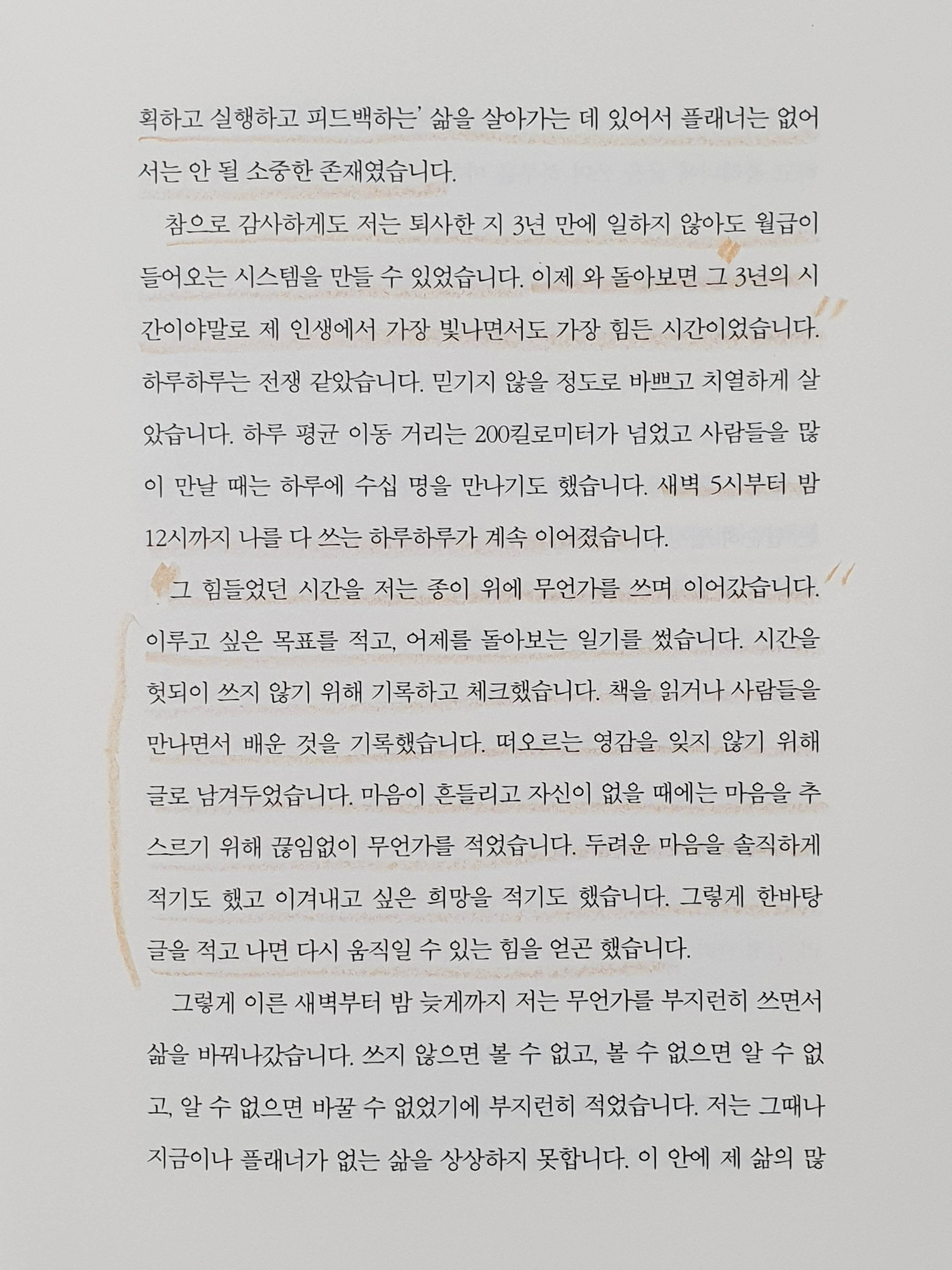 각각의 파트별로 그 파트가 왜 필요하고? 어떻게 작성하고 관리해야 하는지를 알려줍니다. 저는 특히 습관을 관리하는 부분이 좋다고 생각했습니다. 청울림님은 습관을 어떻게 만들고 유지시키고 키워나가야 하는지에 대해서 그 원리를 누구보다도 잘 이해하고 계신듯했습니다. 저 또한 지난 1년간 단 하루도 빠지지 않고 2H1T라는 방법으로 자기경영을 해오고 있는데요. 청울림님의 말씀들이 모두 다 공감되었습니다.