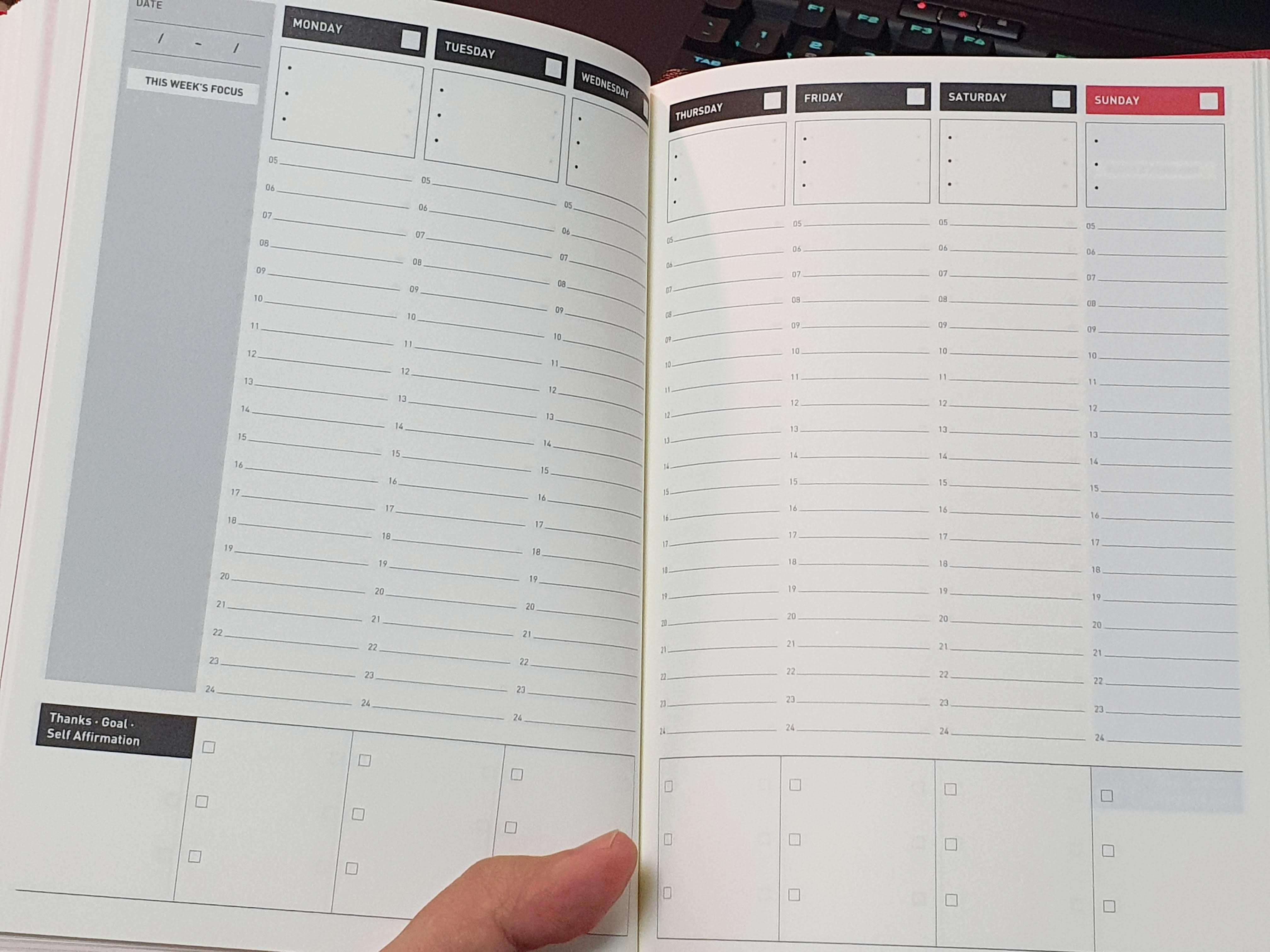 이 책은 플래너입니다. 쉽게 말하면 수첩이죠. 청울림님께서 퇴사를 하고 가장 어려웠던 문제가 바로 자신을 관리하는 것이었다고 합니다. 스스로를 통제하고 목표를 이뤄나가기 위한 무게 중심이 필요했는데, 그것이 바로 다이어리였다고 합니다.
