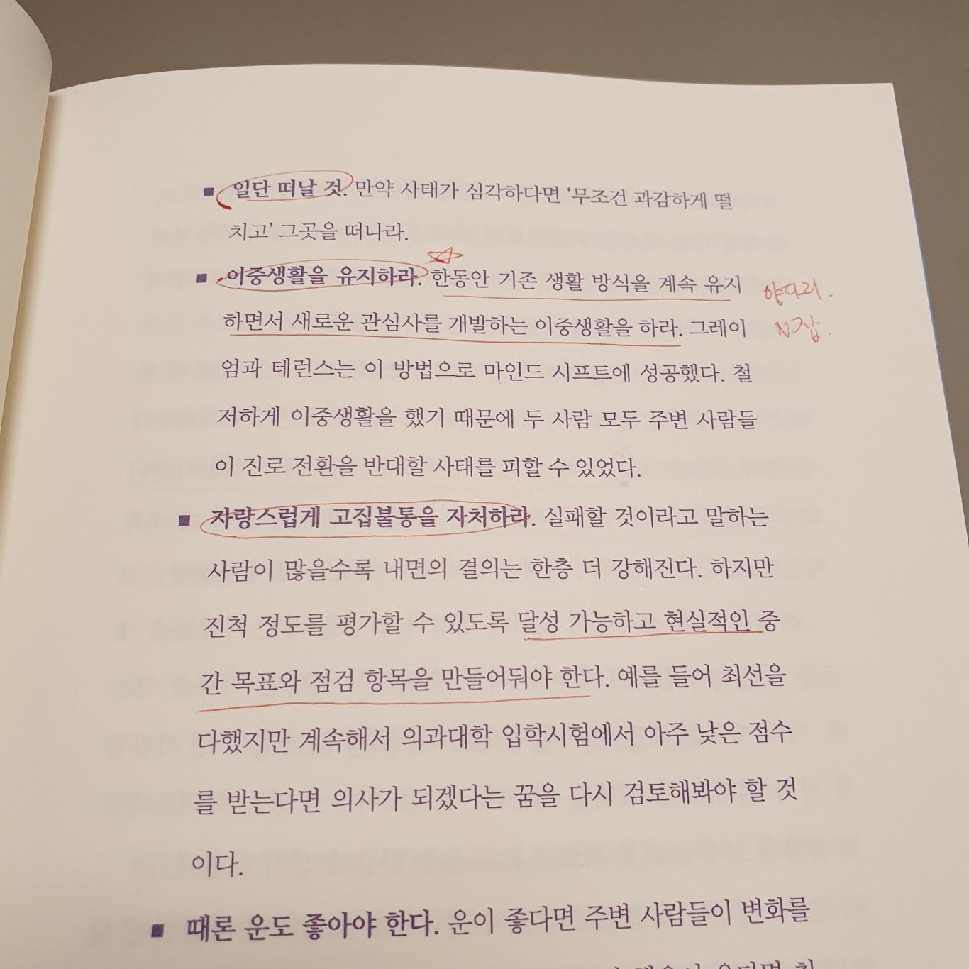 이 책은 기존의 전공이나 직업에서 새로운 직업으로 전환에 성공한 사람들의 이야기를 엮은 책입니다. 저는 어떠한 이론을 중심으로 사례들이 등장하는 것으로 생각했는데, 사례의 비중이 훨씬 더 크고 그 안에서 약간의 원리를 설명하는 방식으로 전개되었습니다.