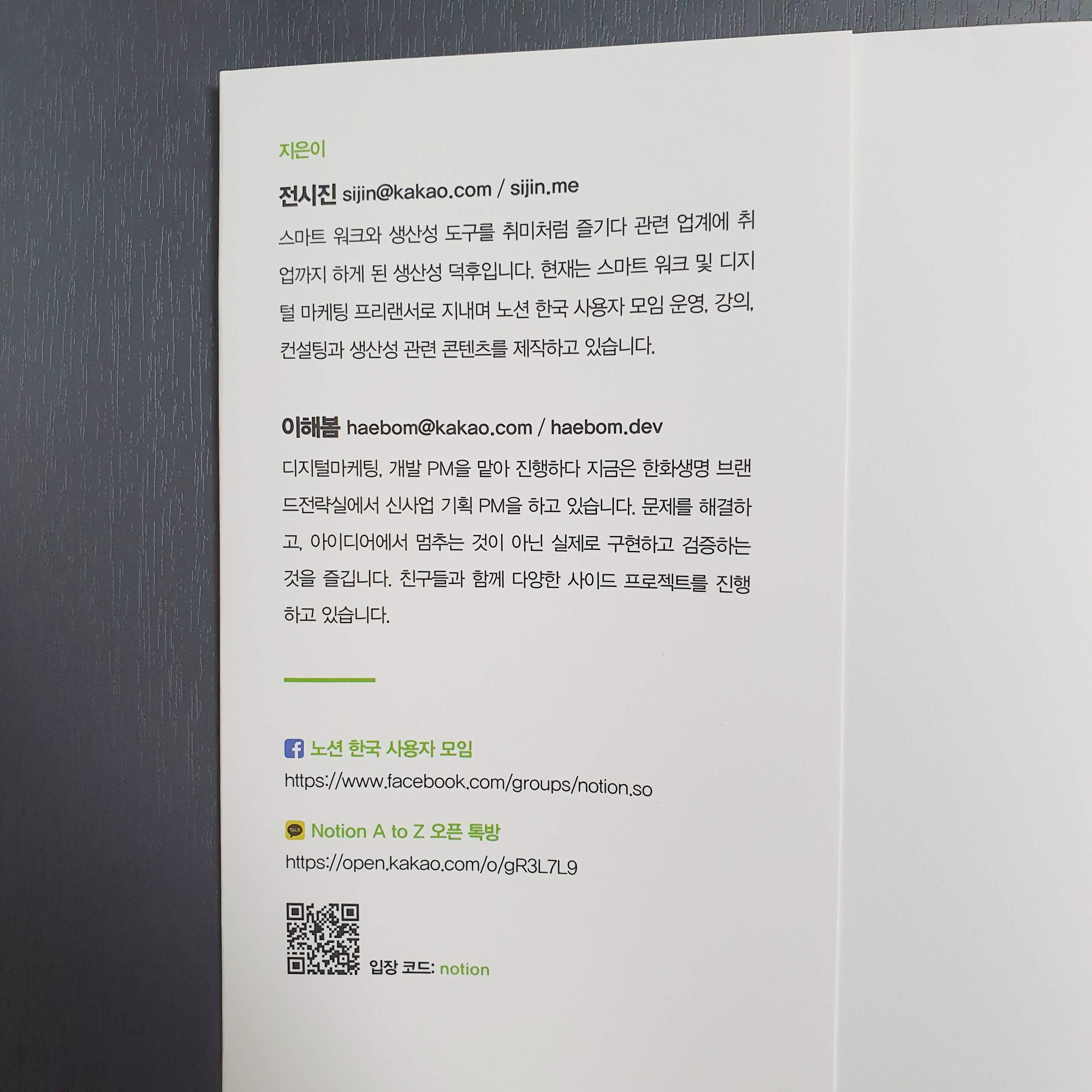 <업무와 일상을 정리하는 새로운 방법 Notion>의 저자는 전시진, 이해봄님입니다. 전시진님은 스마트워크와 생산성 도구에 관심이 많아서 취미처럼 즐기다가 관련 업계에 취업하고 현재는 디지털 마케팅 프리랜서와 노션 한국 사용자 모임을 운영하고 강의도 하고 계신다고 합니다. 이해봄님은 한화생명 브랜드전략실에서 PM업무를 하고 계신다고 하네요 ^^
