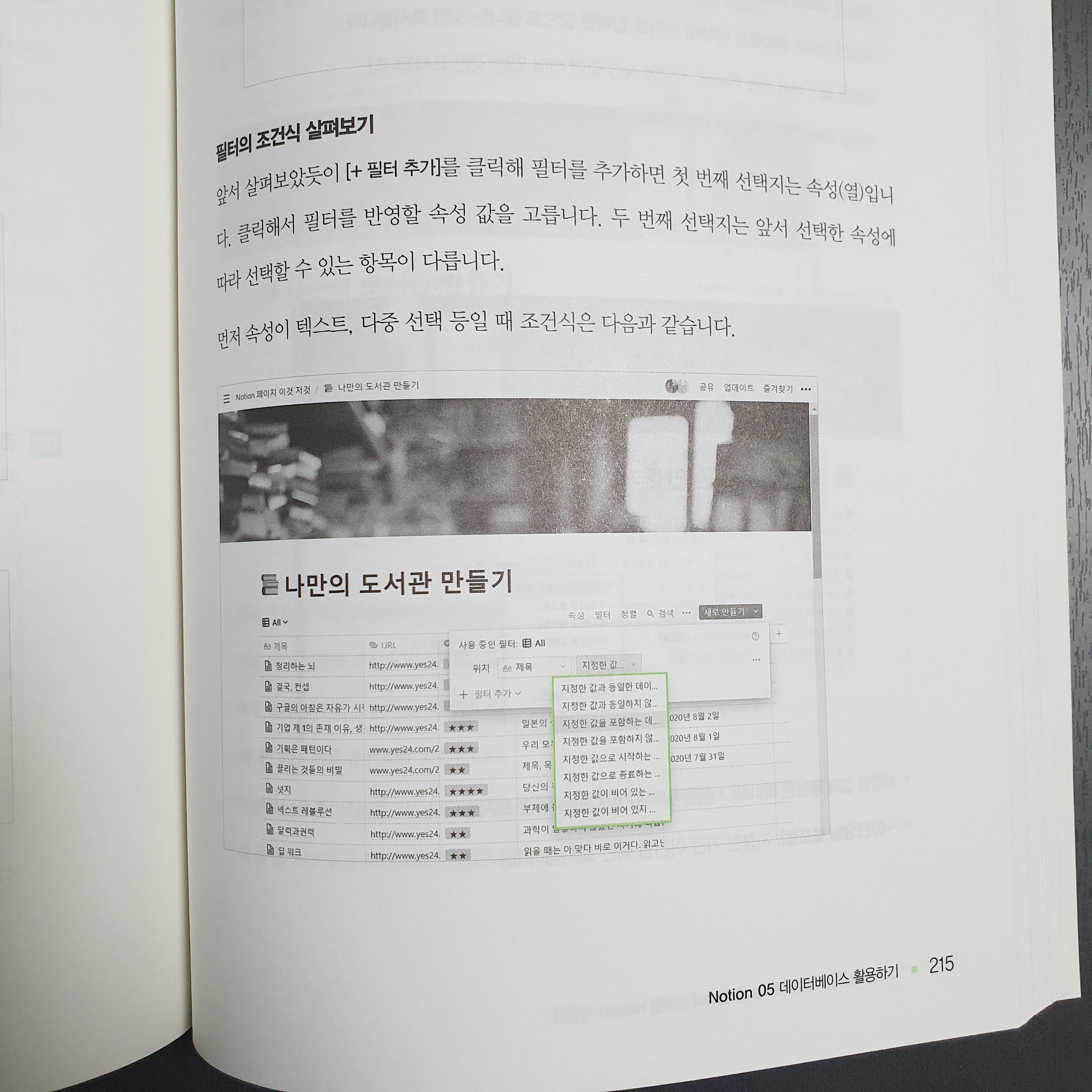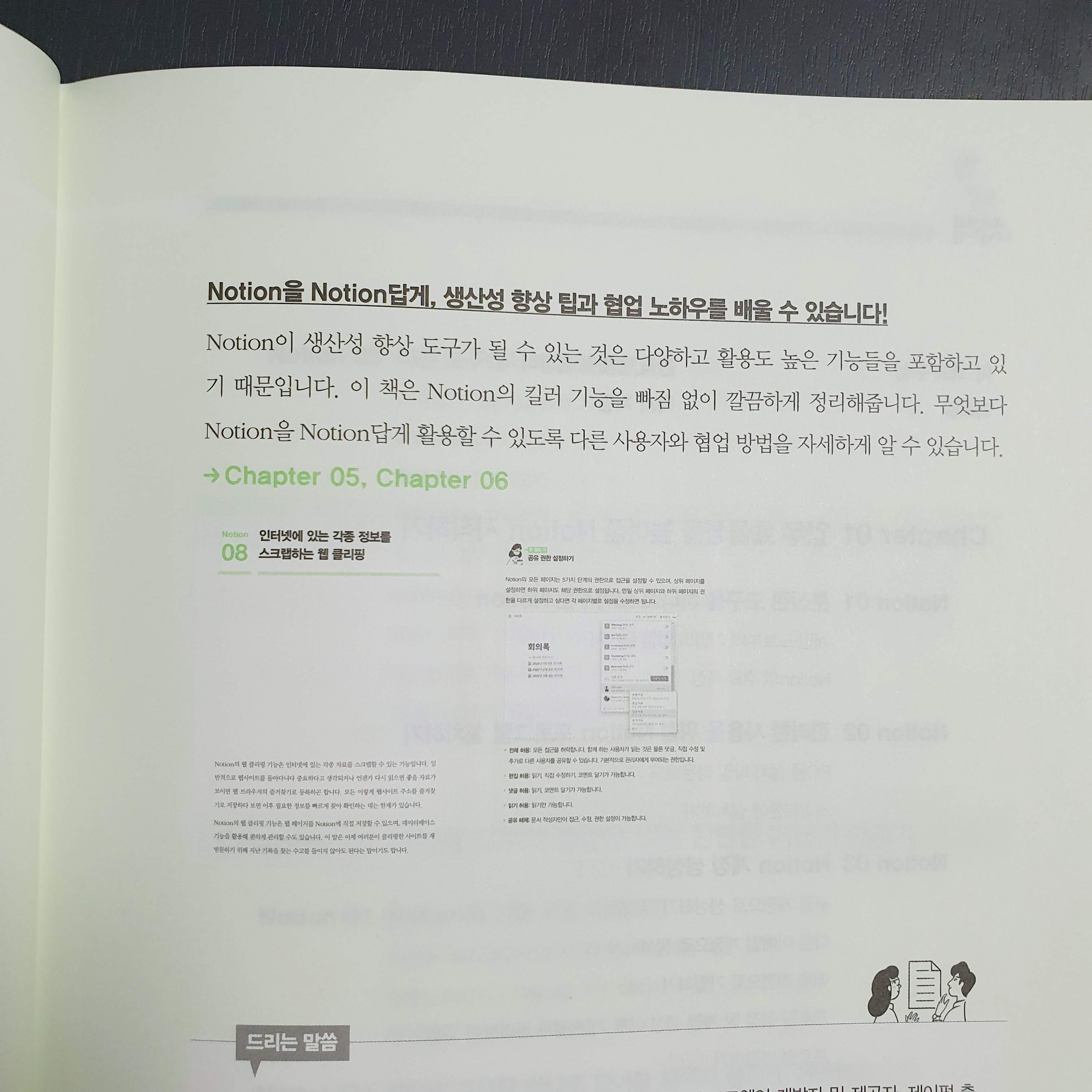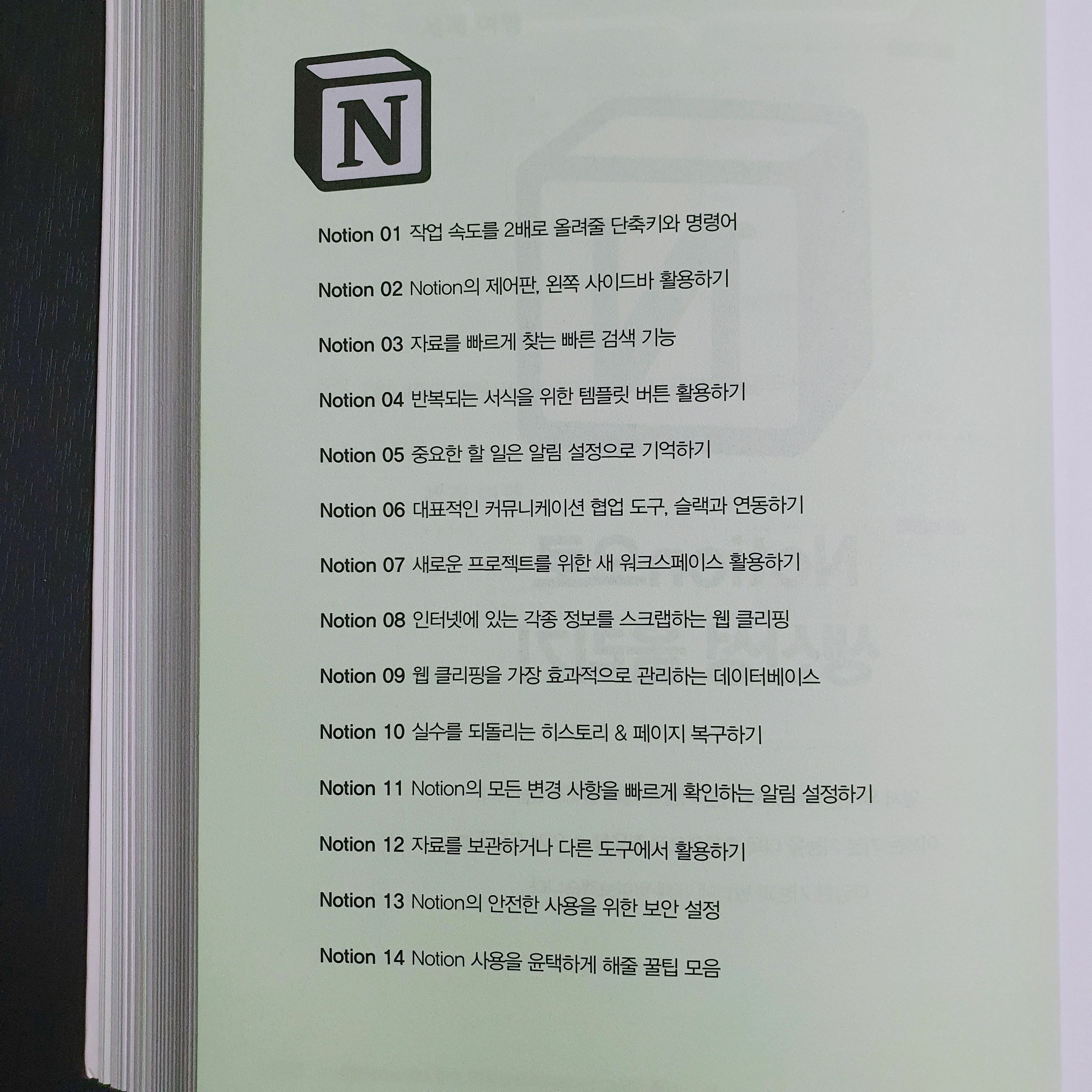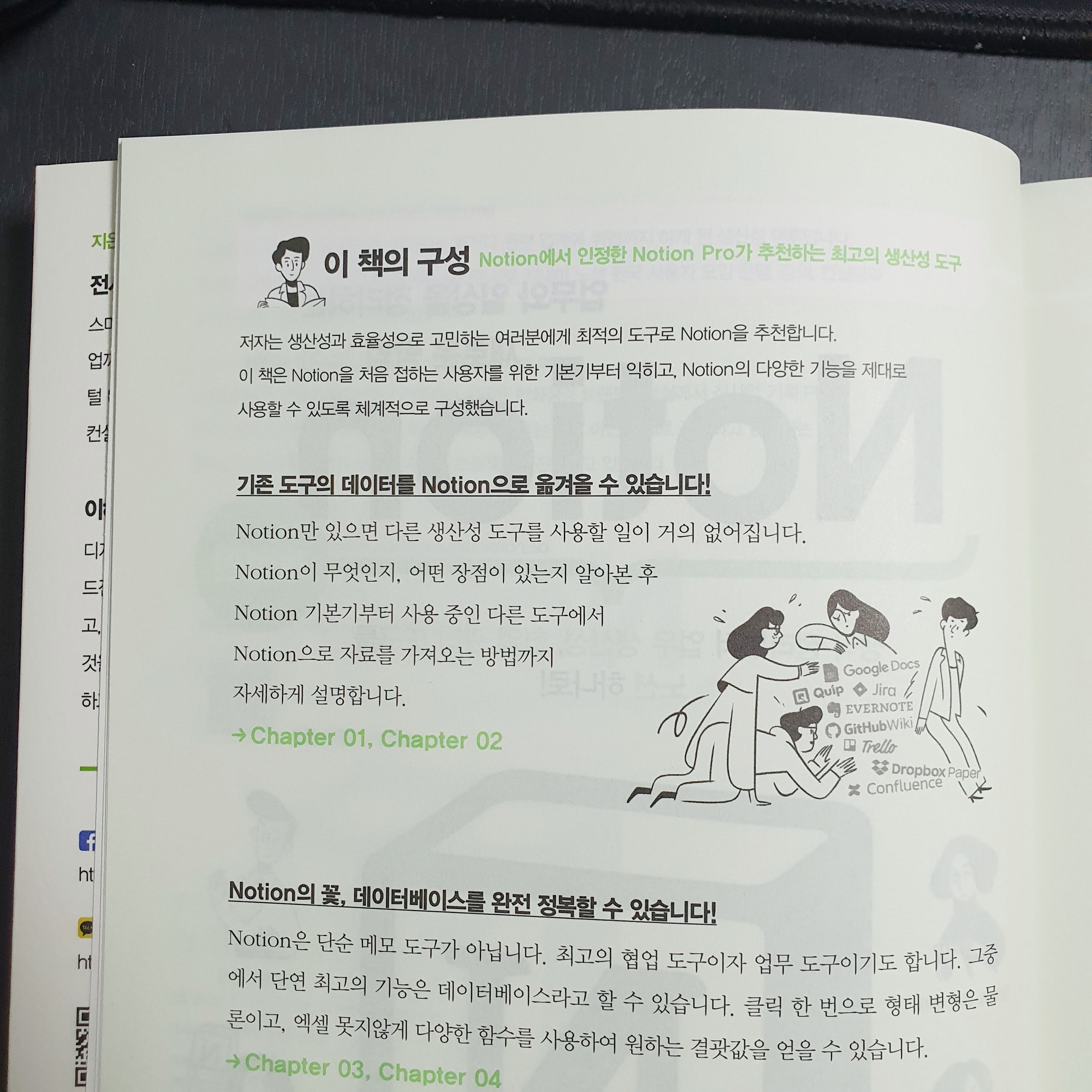 이 책은 처음 노션에 가입하고 다운로드 해서 설치하는 방법부터, 기본 사용법, 노션의 핵심 기능중 하나인 데이터베이스 사용법, 함수 사용법을 설명하고 뒤쪽에는 Notion을 사용해서 생산성을 올릴 수 있는 다양한 팁들까지 설명해주고 있었습니다. 끝부분에는 노션의 강점중 하나인 협업에 관련된 부분도 상세하게 설명하고 있었어요.