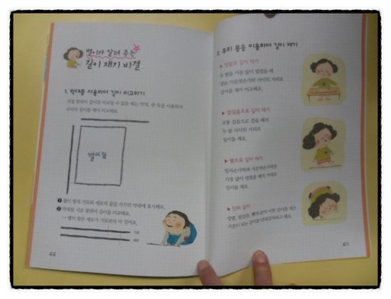 신통방통 시리즈는 우리 아이가 무척 좋아하는 시리즈인데 우선 책의 내용은 이야기식으로 전개되어 있다. 신통방통 길이재기의 주인공은 왕별이라는 친구이다. 왕별이가 길이재기에 대해 차차 알아가는 식이다.  이야기 중간 중간 친구인 은수가 아파서 육지를 떠나게 되고 마음아파하는 이야기를 일기형식으로 기록되어 있어 지루하지 않다. 3학년 수학교과에서 알아야되는 길이재기의 개념인 단위길이가 필요한 이유, 센티미터, 미터, 측정방법,  어림하기, 길이의 덧셈과 뺄셈에 대해서 다 수록이 되어 있다. 이러한 개념이 수학책에서만 나온다면 아이들은 분명히 지루해 하거나 딱딱하다고 느낄 것이다. 그러나 신통방통 길이재기에 나오는 수학적 개념은 절대 지루하거나 딱딱한 느낌이 들지 않는다. 그것은 바로 아이들에게 친근한 이야기로 풀어져있기 때문일것이다. 이렇게 쉽게 접근될수 있는 수학개념이라면 아이들도 절대 어려워 하지 않을것이다. 저학년 아이라면 꼭 반드시 읽어야 할 수학개념서가 아닐까 싶다.