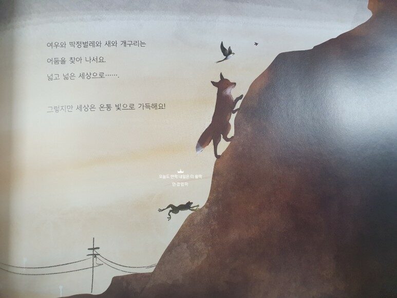 우리 인간들 뿐만 아니라 동물친구들에게도 많은 고통과 스트레스가 되는 빛공해를 다시 한번 생각하게 만드는 그림책이었어요. 없어서는 안되고 아주 우리에게 소중한 빛이지만 그 빛으로 인해 받게 되는 부작용에 대해 우리가 그 문제점을 인지하였으니 개선방안도 실천방안까지 모두 고민해야 할 듯 합니다.