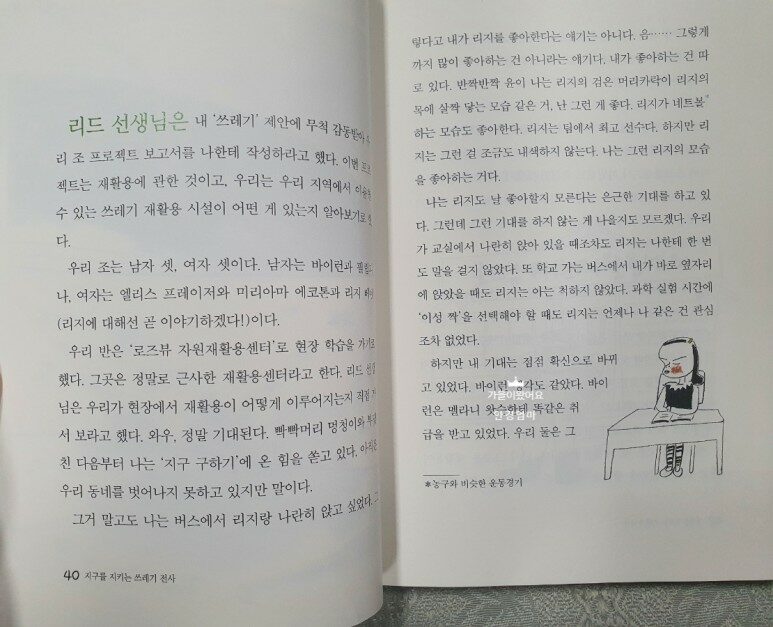 클린은 리드 선생님의 지구지키기 프로젝트가 시작되기 전까지는 평범한 학생이었지만 지금은 황폐해진 지구를 살리는 쓰레기 전사가 되었다. 나는 클린이 한 말 중 "지금까지 나는 애매모호한 태도를 취해 왔다 .그런 태도는 지금까지 충분하다. 이제 진짜 용감해질때가 왔다."라는 말이 제일 기억에 남는다. 조금 부끄럽지만 나도그래왔다. 지금까지 내가 환경에 대해 쓴 글은 아마도 몇 십개가 되고, 그 글 끝에마다 이제는 열심히 환경운동을 할 것이라고 적었는데 실천은 하지 못했다. 그런 행동이 많이 창피했다.