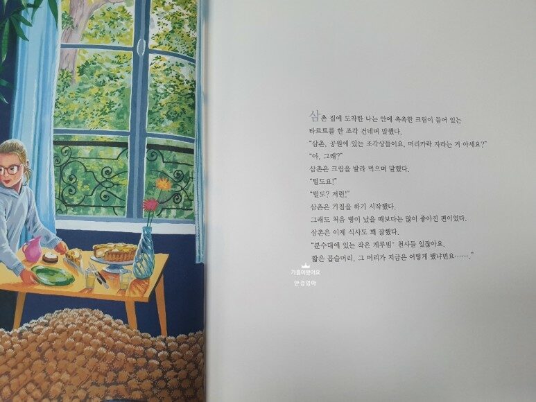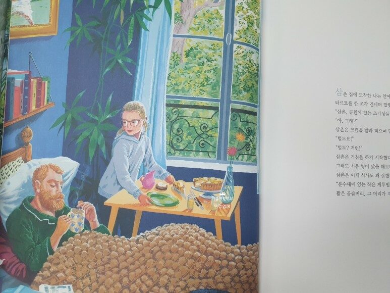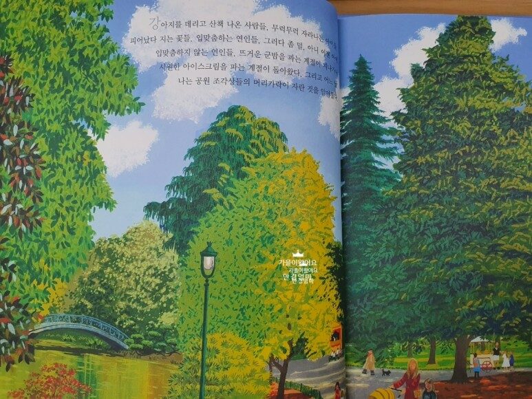 너무 많이 아픈 삼촌이 꼼짝을 못하고 집에만 있기 때문에 아주 사소한 소식이라도 뉴스거리라도 삼촌에게는 신기하고 즐거운 일들이 되니까요. 공원을 찾아갈 수는 없지만 가지 않아도 조카의 이야기만 들어도 공원의 모습이 눈에 그려지는 듯 삼촌은 상상을 해봅니다.