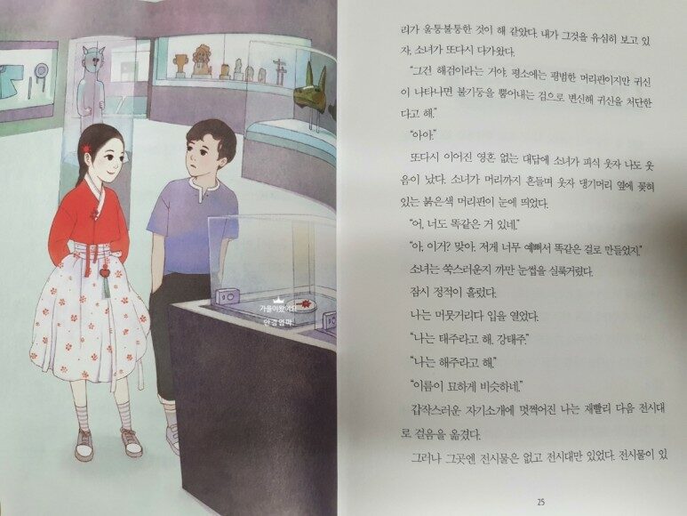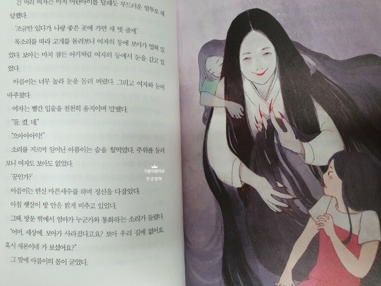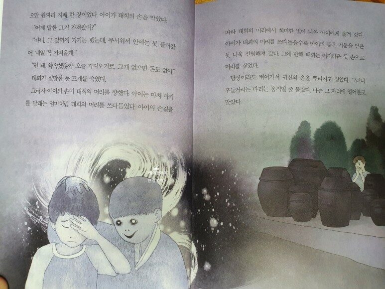 그 때 내 귀에서 "내가 보여"라는 소리가 들렸다. 지금은 어렴풋이 기억나는 해프닝이지만 그 때 한동안은 소름 끼쳐서 혼자 밥 먹는게 살짝 무서울 정도였다. 이 책을 읽고 나서도 잠잘때 무서운 꿈을 꿀까봐 엄마랑 같이 잠을 잤다. 태주와 해주처럼 엄마가 나의 귀신 사냥꾼인듯 하다.