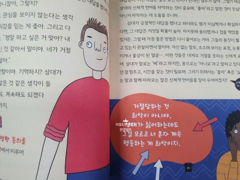 남녀간의 관계도 마찬가지입니다. 나는 싫지만 상대방이 원해서, 상대방이 마음에 상처을 입을까봐 아니면 나를 떠날지도 모른다는 생각에 원하지도 않는 스킨십이나 관계를 이어간다면 결국에는 둘다 상처를 받고 불행하게 됩니다. 나도 원하고 상대방이 원해서 서로가 같은 방향을 보고 사랑을 나늘 수 있는 이상적인 관계에 대해서도 아이들의 눈높이에서 자세하게 설명해주고 있는 책이네요.