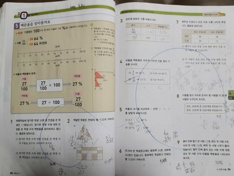 4단원 비와 비율에서는 두 양의 크기 비교(비교하는 양, 기준량), 비, 비율, 백분율을 학습할 수 있습니다. 비와 비율은 두 양 사이의 관계를 수로 나타나는 것으로 규칙성을 가지고 있는 수라고 지칭할 수 있어요. 비교해야 할 두 양을 배우고 이를 표현하고 드러내는 방법을 배우고, 실생활에 완전 빈번하게 사용하는 백분율까지 배우면서 상대적으로 또는 절대적인 비율에 대해 알아가게 됩니다.