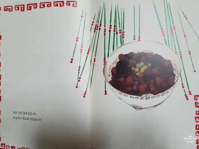 주방에서 국수 사리를 뽑는 털보 아저씨인 아빠와 중국집의 핵심인 신속배달을 책임지는 엄마와 나랑 함께 초등병설유치원을 다니는 할머니 이렇게 4명의 가족으로 구성된 만리장성 중국집은 다들 자신의 자리에서 열심히 부지런히 생활하고 있답니다.