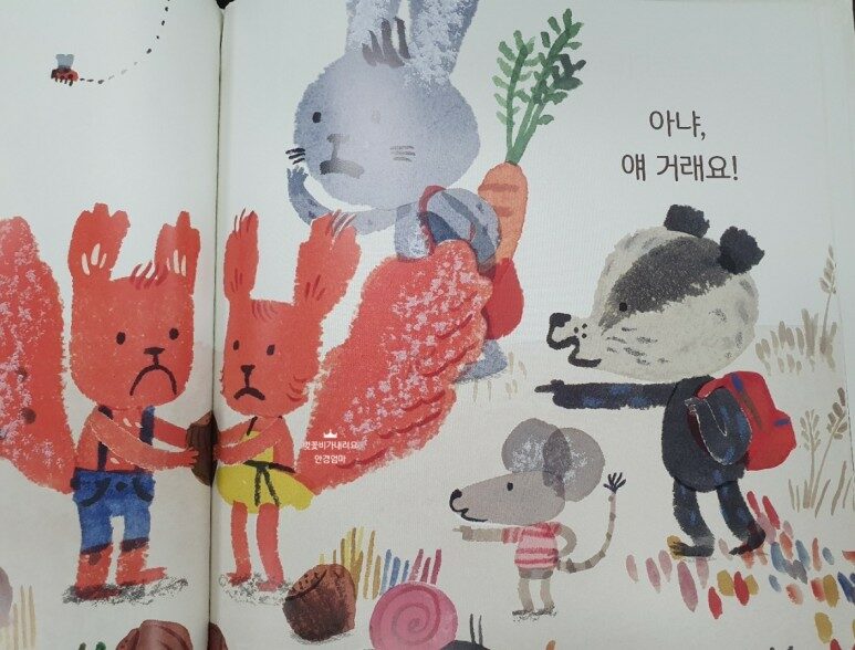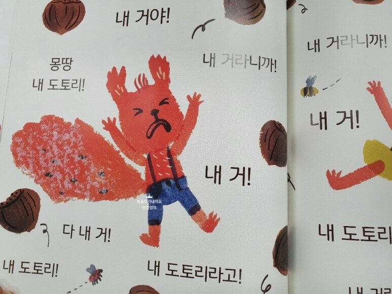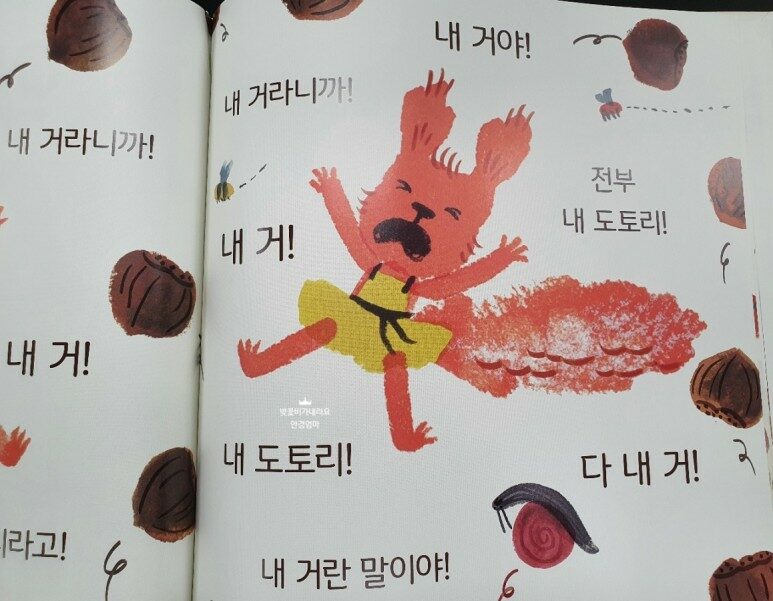 다람쥐에게 도코리는 거의 목숨과 같이 아주 중요한 식량입니다. 그래서 그런지 꼬마 다람쥐 두 마리는 길 위에서 만난 도토리를 모두 자신의 것이라고 주장합니다. 길 위에 가득하게 흩어져있는 도토리를 만나 너무 즐겁고 신나는 마음으로 본인의 수레에 담기 바빴던 다람쥐 두 마리는 나 말고 또다른 누군가가 자신의 도토리를 욕심낸다는 사실만으로 화가 나고 속상한가봐요..