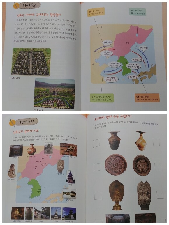 [한국사토론왕03] 보고듣고말하는 호락호락한국사 03 남북국 시대- 보이는 역사- 들리는 역사- 초등 한국사 토론왕앞 권들을 이미 접하여 봤기에~ 허니에듀 서평이벤트 게시글을 보자마자 고민할 것 없이 손 번쩍!! ♥.♥이번에는 어떤 이야기꾼이 또 어떤 재미난 이야기를 들려주려나~?? 기대하면서요~ ㅎㅎㅎ남북국 시대!!??예전에 우리 부모 세대가 배울 때는 "통일신라시대" 라고 배웠는데요~ ^^;이젠 발해의 역사를 당당히 데려와 "남북국 시대" 라고 칭하니~괜히 뿌듯!!!뭔가 더 당당하고 우쭐해지는 기분입니다~♡ ^^당당한 우리 역사인데~ 그동안 너무 홀대했어용~ ♥.♥우리의 역사를 보고 듣고 말하러~ Go Go~!!!1장에서는 전쟁이라는 시커먼 먹구름이 잔뜩 끼었던 시기를~ 먹구름 이야기꾼이 들려주구요~ ^^;2장에서는 하루에 천 리를 달리는 천리마가남북국 시대의 발해와 신라를 달리며(?) 타가닥 타가닥~!!!그동안 잘 몰랐던 발해의 이야기를 정말 재밌게 들었답니다~ ^^3장에서는 서역에서 온 소그드인이 나와서 우리 문화재를 이야기 해 주어요~고구려를 닮았으면서도 다른 특징도 함께 있는 발해의 문화재와~ 불국토가 따로 없는 신라의 수도 서라벌에서의 문화재들!!!4장에서는 그 시대를 살아냈던 여러 인물들에 대한 이야기를~ 2권을 통해 이미 낯익은 솥단지가 들려주는데요~얼핏!! 아는 이야기들도 있고~ 우리가 잘 몰랐던 고선지 장군이나 발해의 홍라녀 이야기까지~여러 분야의 인물 이야기를 다양하게 들려주어서 참!! 좋았습니다~!!보고 듣고 말하는 호락호락 한국사는~??*** 이야기꾼이 재미있게 이야기를 들려주고나서~*** "호락호락 토론방"을 통해서 관련 주제를 주고실제로 토론하는 형식의 대화글이 쭈욱~!!!*** 그리고나서~ "그렇군의 블로그" 정리와 친구들의 댓글 반응!!"딴지양의 블로그" 정리와 친구들의 댓글 반응!!이 책을 읽고 듣고 생각하다보면~??어느 순간!!! 내가~ 그렇군이나 딴지양처럼 토론 주제에 대한 내 생각을 정리하고 말할 수 있도록 자연스레 이끌어 준답니당~토론에 자신없는 아이도~ 이렇게 토론하는 대화글을 보며~ 토론을 위한 기본 자료를 차곡차곡 모을 수 있게 되는 거지용~ ^^