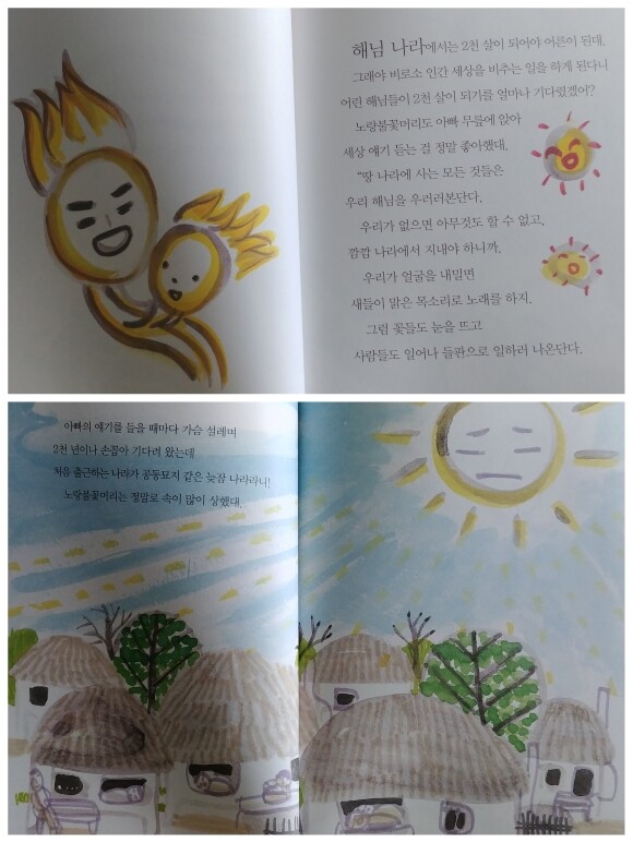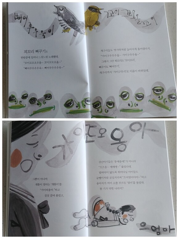꾀꼬리, 뻐꾸기의 울음소리가~~~"꼬이꼬오오오올~ 꼬이꼬오오올~""뻐어꾸우우우욱~ 뻐어꾸우우우욱~"개구리도 엿가락 늘어지듯~~~"가이구우우우울~ 가이구우우울~"그래서~???늦잠 나라의 꾀꼬리는 "꼬이꼬리", 뻐꾸기는 "뻐어꾸기", 개구리는 "가이구우리"로~~~이름까지 바뀌었다네요~~~~ ㅋㅋㅋㅋ엄마도~ "으어엄마아아~" 늘어진다~ 늘어져~ 엿가락처럼 쭈욱~!!! ^^;이게 무슨 말인지~??? 글로 보기만 하는 것보다, 따라 읽어 보며~아하!! 하게 되는 재미가 쏠쏠~하게 있어용~~~ ㅋㅋㅋ그런데~???첫 출근하기를~~~2천 년이나 손꼽아 기다려온 노랑불꽃머리 해님~!!!하필!! 처음 출근하는 나라가 바로 "늦잠 나라" ㅡ0ㅡ;;;아무도 반겨주지 않는 늦잠 나라에서 노랑불꽃머리 해님은 너무나 속이 상했겠지요~??? ㅠㅠ그러나~???정말~ 어이없고 황당하지만~ 우리네 옛이야기의 멋이 느껴지는재미난 이야기는 그 다음부터~~~ ^▽^자세한 내용은 책으로 직접~!!! ^^;잠자리 동화로 읽다보면~ 잠이 달아나 버릴지도 모를 "부작용"이 있을 정도의 재미 가득!!! ㅋㅋ이 책 속에 숨어있는~ 그 재미를 쏙~ 뽑아 드세용~~~ ㅎㅎㅎ책 읽기의 즐거움~♡이 세상 모든 잠꾸러기들에게~잠이 홀딱 달아날 만큼 재미난 이야기를~직접 소리내어 읽어보라고 권하고 싶습니다~♥