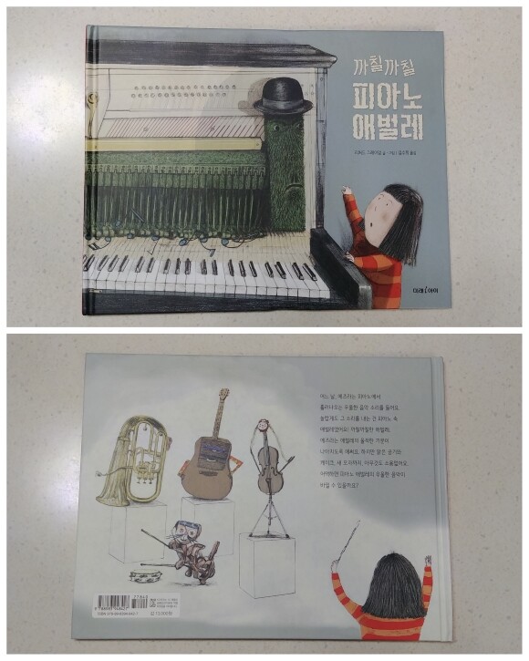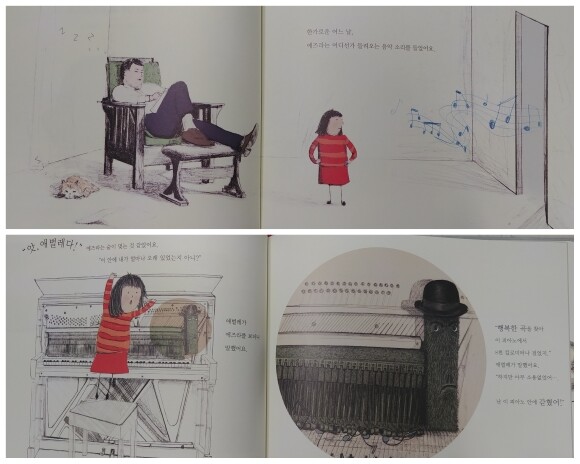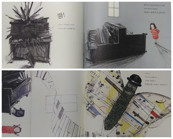 <까칠까칠 피아노 애벌레>까칠까칠!!! 무뚝뚝한 애벌레~!!! 책을 받자마자~ 애벌레가 따로 있는 것이 아니라~피아노 그 자체인 것 같다는 느낌이 들었답니다.애벌레와 피아노를 구분하고 싶다는 생각에그림책의 그림들을 제법 꼼꼼히 들여다 보다가~그냥 피아노 자체가 애벌레로 보임~!!!그 피아노를 연주하는 여자아이가 우울하고 힘들고 슬픈 것을 애벌레로 표현한 건 아닐까~?? 그런 생각도 들더라구요~ ^^;피아노~!!!요즘 우리 아들이 조금씩 재미내기 시작한 악기랍니다~ ^^얼마 전~ 토요일에 1시간정도 아들 혼자 집에 있었던 적이 있는데요~걱정되어 급하게 집에 돌아온 엄마랑 다르게~ 누나방에서 혼자 뚱뚜둥~ 전자 건반을 치며 놀고 있더라구요~♪ 그것도 소리도 안 켜공~ ^^;혼자서도 잘 놀고 있었구나~ 안도와 기특함이 함께 몰려왔었답니다~ ♥.♥피아노 관련 그림책을 보자마자~ 갑자기 혼자서 피아노 치며 놀고있던 아들의 모습이 매칭되더라구요~~~ ^^;집에 들어오자마자 아들을 안아주며~ 건반 전원을 켜주고~ 잘한다고 으쌰으쌰 해 줬더니~ 학원에서 배운 책을 찾아와 펼치고는 본격적으로 띵똥땡~!! 건반 누르며 선생님께 배운데로 엄마에게 설명도 해주며~ ♬혼자서도 얼마든지 즐겁게 피아노 칠 수 있는 울 아들~!!! ^▽^책 속의 애벌레가 울 아들에게 한 수 배워야겠어용~ ㅎㅎㅎ제가 느낀 이 그림책은???에즈라가 이런저런~ 다양한 변화와 도전(?)을 통해서 스스로 슬픔과 우울함을 이겨나가는 이야기~??? ㅎㅎㅎ혹!!! 에즈라의 감정 변화를 애벌레로 형상화 한 건 아닐까요~~~ ^^;까칠한 애벌레가 아니라??? 까칠한 에즈라??? 우울함 → 살펴봄 → 슬픔, 울적, 우울한 감정→ 신선한 공기 제공 → 맛있는 음식 → 멋진 새 모자로 꾸밈 → 여러 악기와 밴드 연주→ 즐거움 → 쾅! → 파닥파닥 → 아름다운 나비→ 즐거운 춤과 노래행복한 연주 방법을 터득한 에즈라!! 해피엔딩!!그런데 보통~??? 애벌레에서 나비가 될 때에는~ 환골탈태를 기대하기 마련이거든요~ ^^;하지만!!!! 털 북실북실 애벌레 그대로에~ 날개만 돋아 있어서 헉!!! 했던 그림~!!!"아름다운 나비" 라고 적혀있지만~~~음~~~~~~~~ ㅡ0ㅡ;;;게다가~ 이 책은~ 번데기 과정은 생략~???(애벌레!!! → 번데기??? → 나비!!!)아니면~ 쾅!! 하는 순간 아주 잠깐~??? ㅋㅋㅋ날개만 보면 나름~ 예쁘지만 몸통이 헐!!!털이 북실북실하고 다리 많은 아이들은 갠적으로 여엉~!! 제 취향은 아니예요~ >.< 이 그림책은 피아노 건반과 악보, 음표 등이 그림 전체에 자연스레 스며있는 음악 그림책인 것 같아요~♪에즈라의 다리도~ 음표 ♬ 그림으로 표현되어 있다능~ ^^;너무 약해 보이기도 하지만~!!나름의~ 특색 있어 보이기는 해요~ ㅋㅋㅋ첫 페이지에서 졸고 계시던 아빠의 방문(?)으로에즈라의 상상 속 나라(?)는 사라지며~책은 마무리 되네요~하지만~ 앞으로~ 에즈라와 피아노는 슬프고 우울한 연주가 아니라~행복한 곡을 연주하며 즐겁게 춤추고 노래할 수 있을거라능~~~ ♥.♥허니에듀 밴드의 서평이벤트를 통해 출판사로부터 도서를 제공받았어요~감사합니다~♥