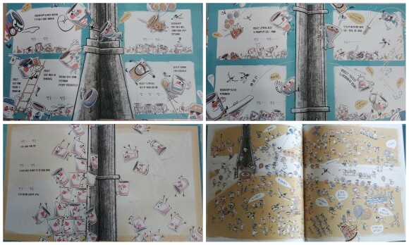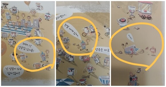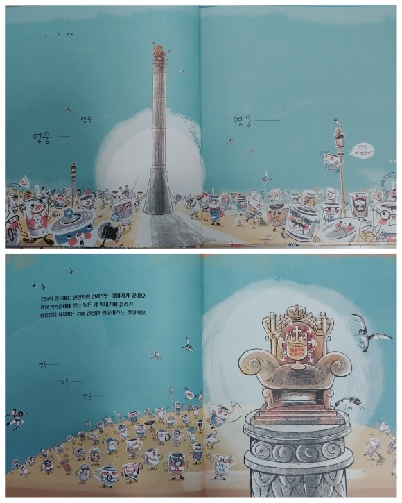 귀엽고 아기자기한 그림 속에서~ 묵직하게 던져지는 메세지!!!내가 영웅이 되겠다고 나서는 사람!!!자기에게 주어진 책임을 묵묵히~ 잘 해내는 사람!!!진정한 영웅이 누구인지? 영웅이 무엇인지?다시금 생각하게 하는 책이였습니다~ 표지를 넘겨 면지를 보는 순간~!!우와~ 컵이 정말 많다~!!! ㅡ0ㅡ그런데 어느 것 하나~!! 같은 모양, 같은 표정이 없네요~ (^-^)b책을 제대로 보기 전 부터~~컵 모양과 표정을 챙겨보는 재미도 있어용~ ㅎㅎㅎ높은 탑 꼭대기에 있는 전설의 "영웅컵"을 획득 할~ 진정한(?) 영웅을 기다리는 컵들의 왕국~!!!영웅컵을 차지하겠다고 노력(?)하는 수많은 컵들!!!각양각색의 방법으로 도전하고 있어요~ ㅋ그림 하나 하나 보는 재미가 있는 책이랍니다. ^^헐~!!! 가짜 영웅컵 판매도 하고 있네요~ >.<그림 속~ 파란 고깔모자를 쓰고 있는 컵이~ 좋다고~ 신나서~ 가짜 영웅컵을 구입해서 가다가 그만~!!!몇 페이지 못 가고~ 돌뿌리에 걸려 넘어졌네요~~~ ㅋ와장창~!!! 빠직~!!! zzZ"짜가" 사믄~ 그리~되는겨~!!! ㅋㅋㅋ중간 중간 위트있는 그림과 표현들!!!각각의 컵들이 무슨 이야기를 하는지~??페이지별~ 찾아보는 재미도 쏠쏠~ ㅋㅋ많은 컵들로 매일~ 북적이는 광장!!!그 속에~ 그 많은 컵들과 함께 쓰레기도 많네요~ ㅠㅠ완전 웃픈 현실들이 여기저기 골고루~제대로 반영된 그림책이더라구요~ T^T그 속에서~ 묵묵히 자기 할 일을 하고 있는~ 청소부 샤오바!!!