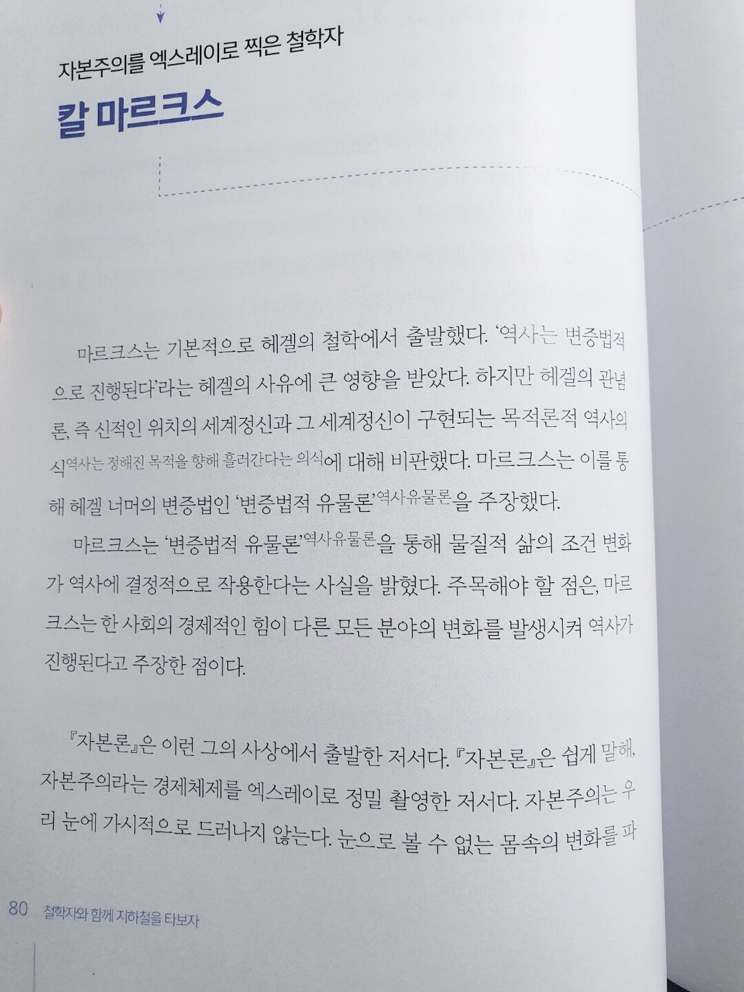 지하철. 나는 편도 지하철 1시간 거리를 일주일에 5번 왕복하는 직장인으로서 이 책의 제목을 들었을 때 '혹'할 수밖에 없었다. 1시간은 그리 짧은 시간이 아니다. 어떤 방식으로든 의미 있게 이 시간을 활용하고 싶은 나에게 이 책은 충분한 매력을 지니고 있었다. 나는 고등학교 시절 윤리 과목을 공부했을 때, 철학에 큰 흥미를 느끼기 시작했다. 어느 날 내가 철학과를 가면 어떨까요? 하고 부모님께 말씀드렸더니, 평생 공부할 자신이 있냐고 말씀하셨던 기억이 난다. 그만큼 철학이란 파고들면 파고들수록 복잡하고, 그 학문의 범위가 크다는 의미가 아니셨을까?