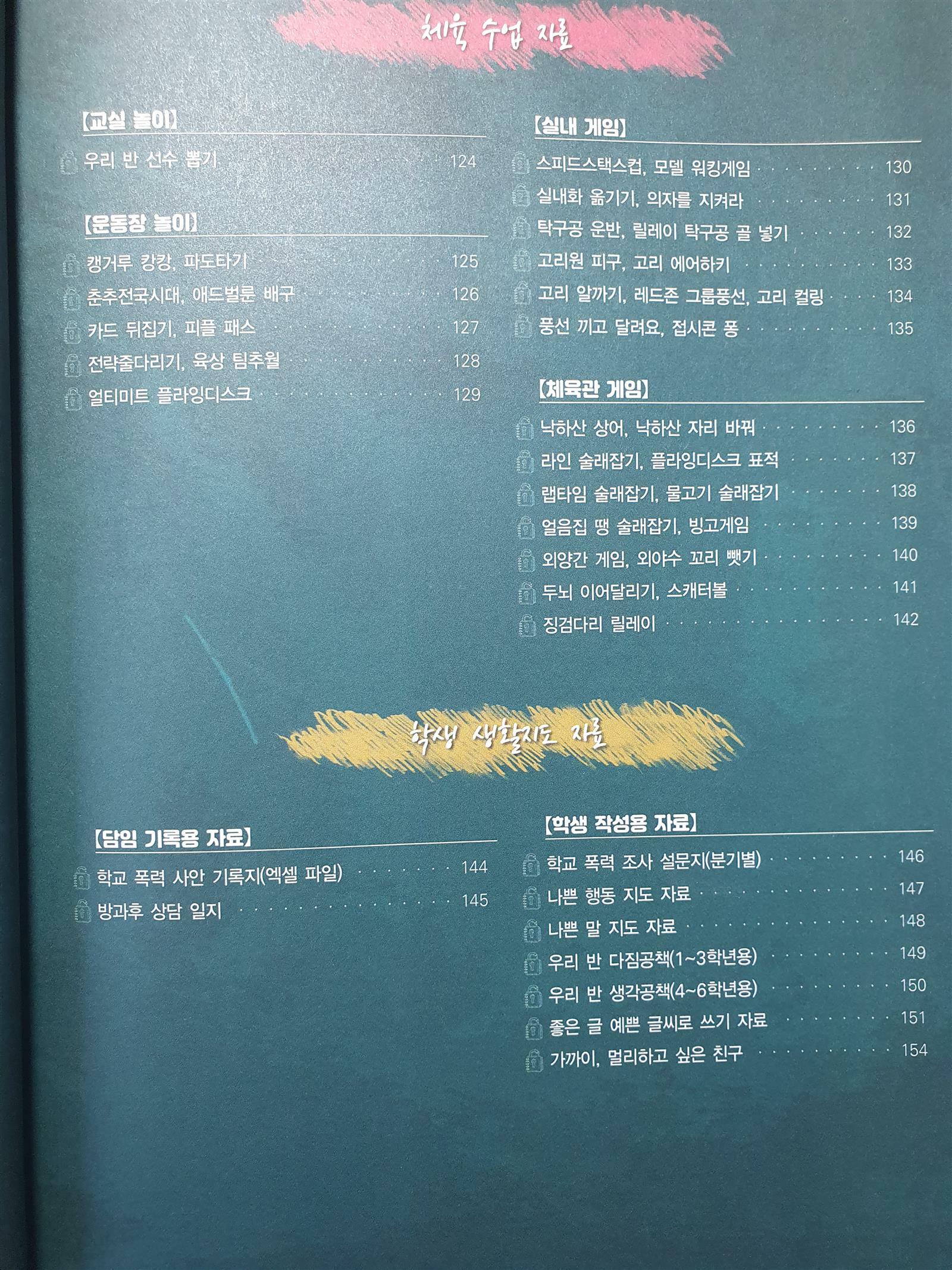 선생님께서 어떻게 이렇게 디테일한 모든 부분까지 집필이 가능하셨던 것인지, 다른 선생님들로부터 조언을 구해서 열정을 발휘하실 수 있으셨는지 이해가 되는 페이지였다. 더불어 나까지도 학급 경영에 대한 욕심과 열정이 좀 더 불타오르는 느낌까지 받았다!ㅎㅎㅎ 책 속에 등장한 몇 가지 활동은 당장 개학하면 바로 올해 학생들과 실행해보고 싶다! 주변에 신규 선생님들 혹은 본인의 학급 운영에 권태가 오신 분, 임용 준비를 하는 분들이 계시면 선물해 드리고 싶은 책이다.