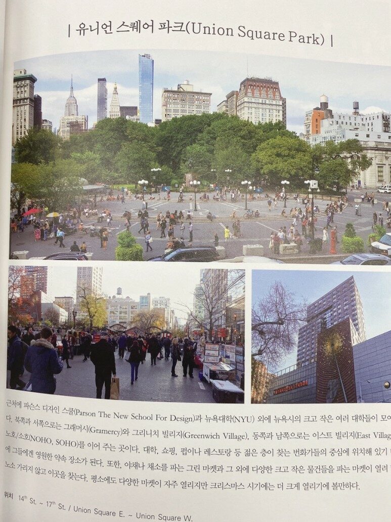 책을 읽을수록 작가님의 성격을 나도 모르게 그려보게 되는 책 내지 디자인이다. 장소의 이름, 위치, 세 개 내외의 문단으로 이루어진 소개는 작가님께서 뭔가 깔끔하시거나, 정돈된 것을 좋아하시는 분은 아닌가 하는 짐작을 하게 했다. 큼직큼직한 선명한 사진, 그리고 흰 색의 책 내지는 뉴욕 사진에 흠뻑 빠지기에 충분한 디자인이었다.