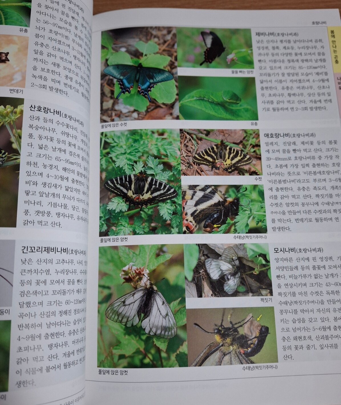 반면 성인 독자들은 이 이미지들을 참고하면서, 중간중간에 담겨 있는 세부적인 설명들을 꼼꼼하게 읽어보며 곤충의 특징, 생태, 습성까지 깊이 있게 이해할 수 있다는 점에서 매우 유익한 책이라고 느끼실 것 같습니다. 예를 들어 잠자리만 하더라도, 어렸을 때는 시골에서 주로 고추잠자리만 접해보았는데, 이 책을 통해 참실잠자리, 북방아시아실잠자리, 홀쪽이잠자리, 밀잠자리, 부채장수잠자리, 큰밀잠자리, 긴무늬왕잠자리 등 다양한 종류가 존재한다는 사실을 알 수 있어요. 이처럼 한 가지 곤충 안에서도 다양한 종류와 특징을 세분화하여 보여준다는 점에서 매우 만족스러웠습니다.
