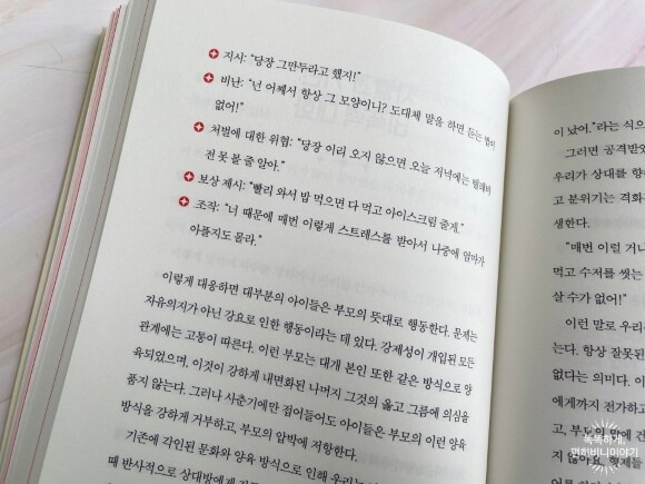 정말 뭐 하나 빠지지 않고 해본 적이 있는 ㅠㅠ 이 안좋은 언어습관을 어떻게 바꿔야할지 고민스러워요. 분명 이 방법이 나쁘다는 걸 알면서도 즉각적으로는 아이가 지시에 따르니 자꾸 사용하게 되는 이 악순환을 벗어나는 방법을 제시해주고 있어요.