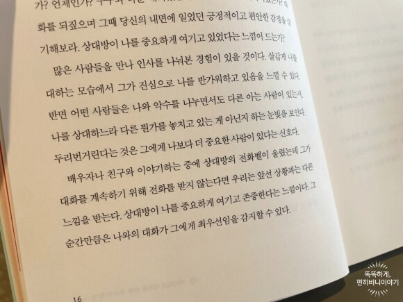 이 내용을 보고 반성이 되었어요. 충분히 생각할 수 있는 부분이었는데 과연 내가 아이와의 대화중에 아이가 자신의 중요함을 느끼게 해주었나 하는 생각이 들더라고요. 당연히 아이는 기다려야한다고 기다릴 수 있다고 생각했는데 사실 아이가 기다려주는 만큼 나도 먼저 아이와의 대화를 우선해주어야한다는 마음을 먹을 수 있었습니다. 기다릴 수 있다는 것과 자신이 존중받았음을 느끼는 감정이라는 것은 다른 문제니까요.