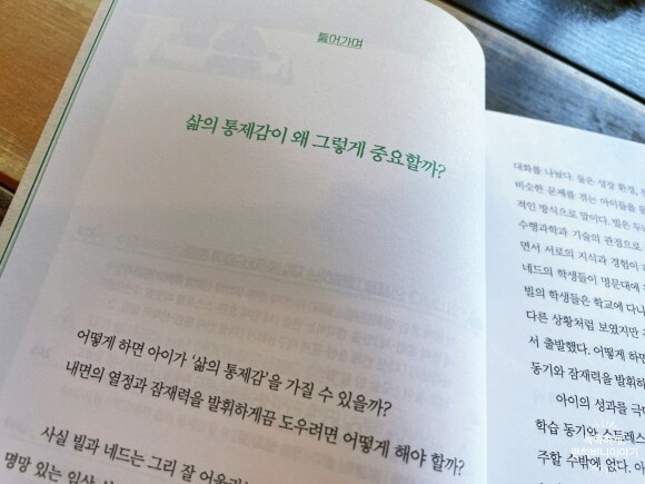 저자는 사람은 세상에 영향을 끼칠수 있다는 효능감을 느낄 때 더 좋은 성과를 낸다고 합니다. 이것이 삶의 통제감이라 볼 수 있죠. 내가 스스로 결정하는 아이가 더 행복하고, 스트레스를 덜 받고, 궁극적으로 인생을 더 잘 헤쳐나가는 것이 같은 맥락에서 당연한 이야기 입니다.