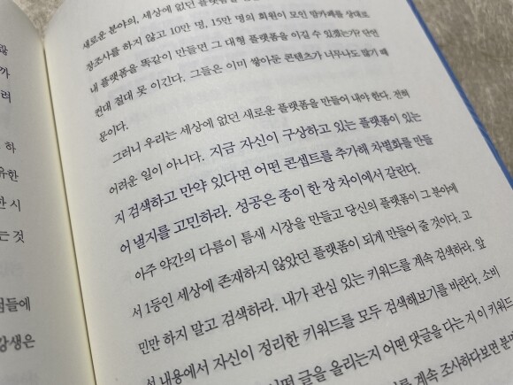 " 지금 자신이 구상하고 있는 플랫폼이 있는지 검색하고 만약 있다면 어떤 콘셉트를 추가해 차별화를 만들어 낼지를 고민하라. 성공은 종이 한 장 차이에서 갈린다. p.163"
