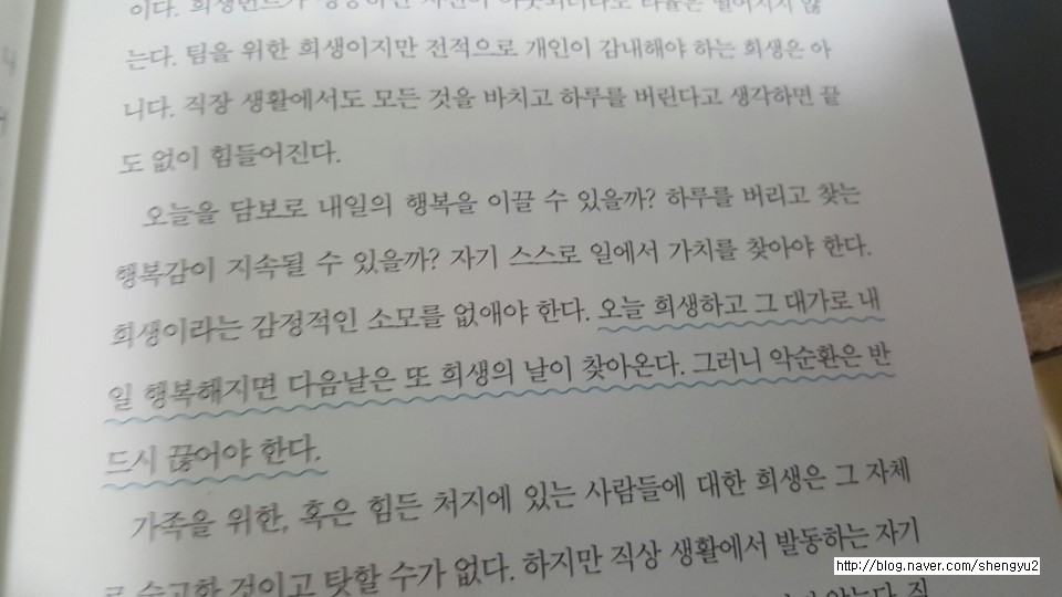 자신의 일에서 가치를 발견해야 한다. 그런 가치없이 매일 매일이 희생하는 삶은