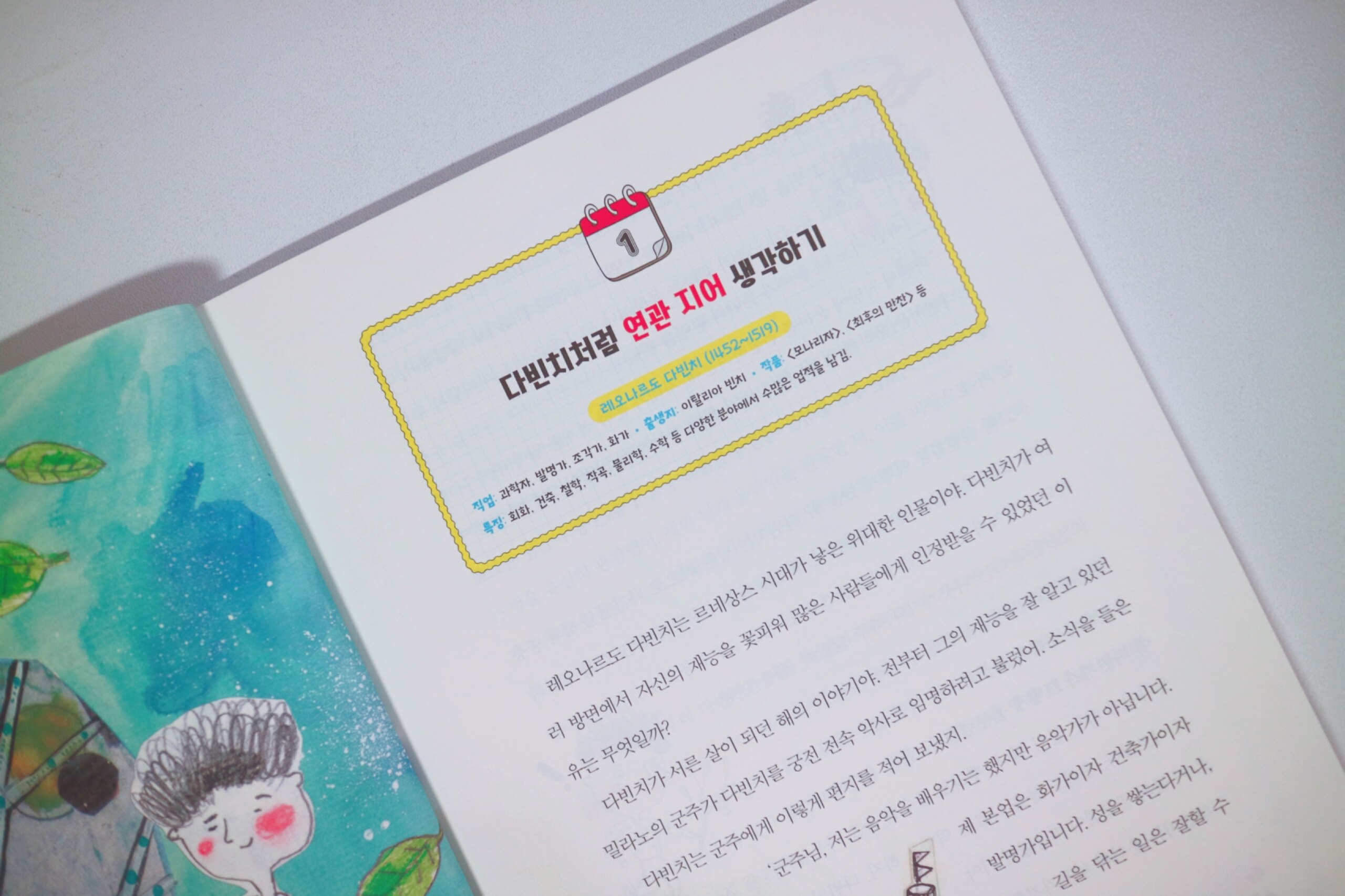 1주 - 새로운 것을 생각해 내는 힘인 창의력에서는 다빈치, 알렉산더, 플레밍, 케쿨레, 로댕, 덩컨, 채플린을 통해 고정 관념에서 벗어나 색다른 상상력을 발휘할 수 있게 도와줘요.