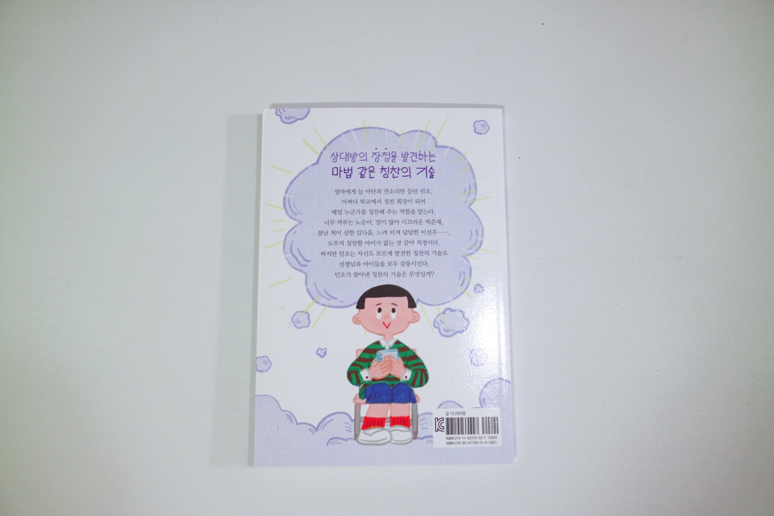 도서 [칭찬의 기술]은 엄마에게 매일 야단과 잔소리만 듣던 민오가 칭찬 회장이 되어 친구들을 칭찬하게 되며 일어나는 이야기예요.