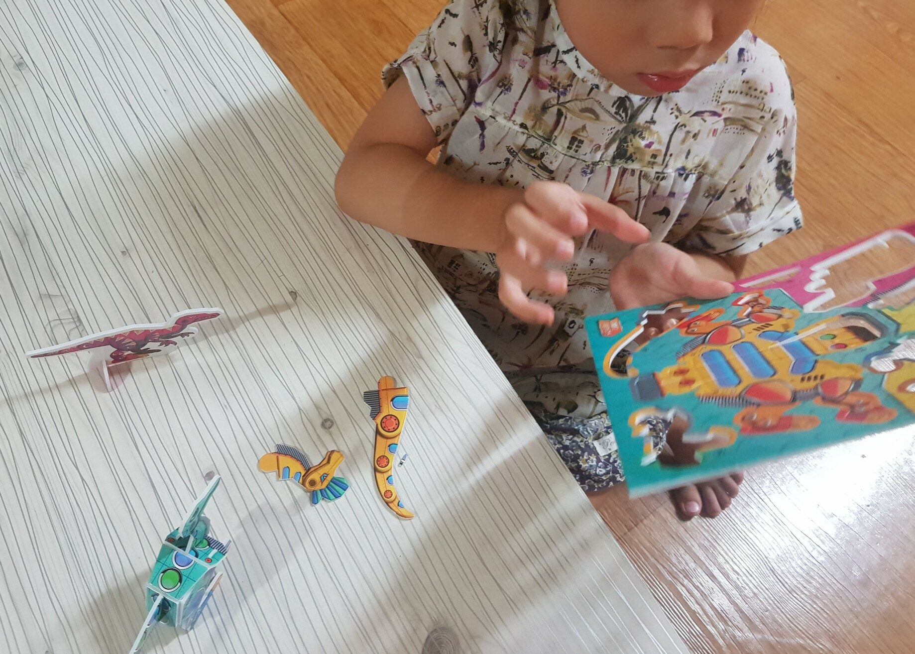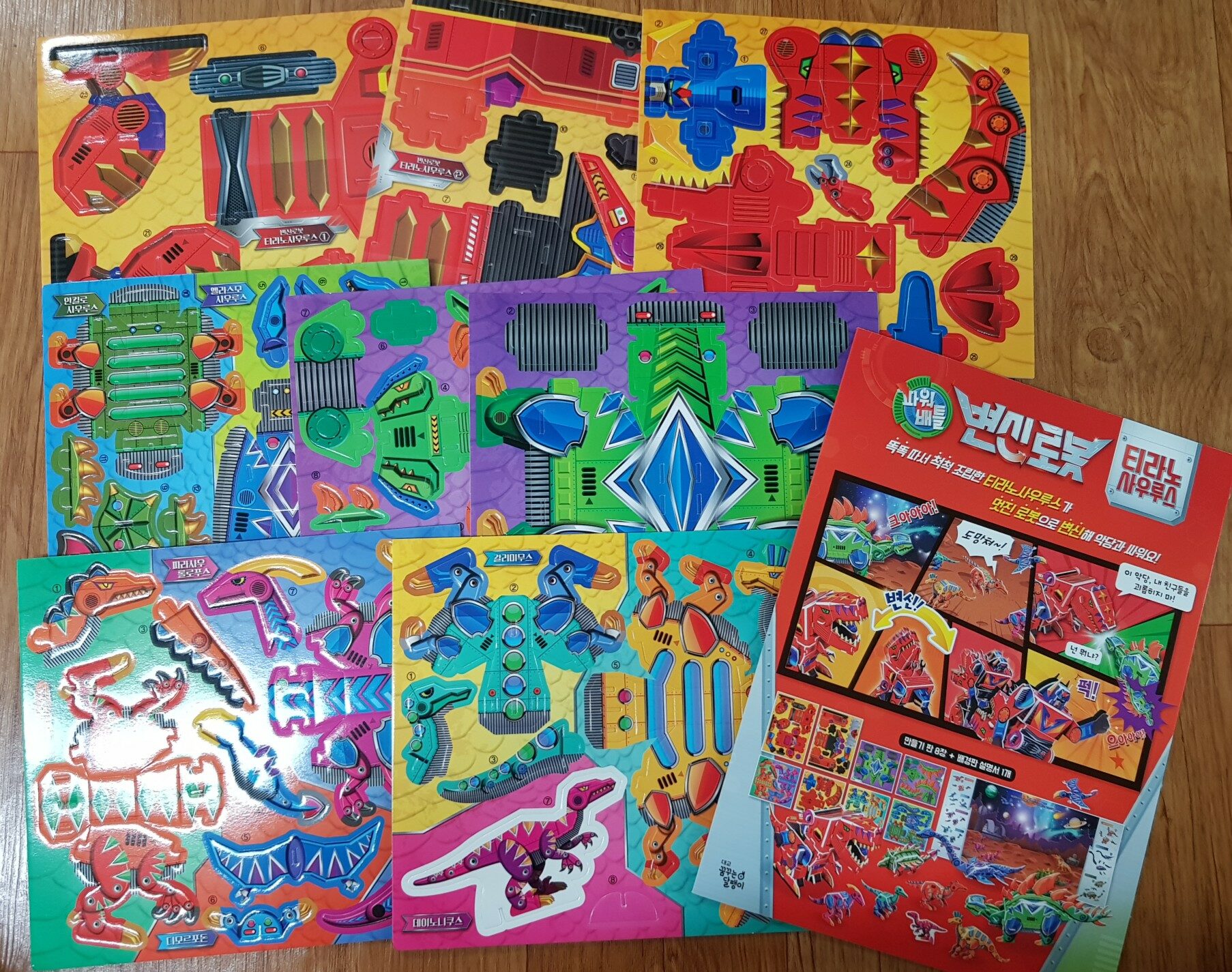 똑똑 따서 척척 조립하여 탄생하는 티라노 사우루스 그 티라노 사우루스가 멋진 로봇으로 변신한다. 조립 인형이 변신까지. 정말 멋진 생각으로 아이들의 호기심을 자극한다. 손으로 만드는 걸 무척 좋아하는 우리 딸들 주말에 딸들이랑 같이 공룡 만들기 시간을 가졌다. 시간 가는 줄 모르고 집중해서 만들어 보았다. 우선 책 구성부터 살펴본다 만들기 판 8장과 배경판 설명서 1개로 구성되어 있다. 우선 두 세개 조각으로 만들 수 있는 공룡부터 아이들과 함께 만들어 본다. 톡톡 조금만 힘을 주면 쉽게 만들기 판에서 분리 된다. 정교하게 만들어져 끼우는 것도 어렵지 않다. 구부리고 끼우면 간다한 공룡 인형이 완성된다. 바라오닉스 디모르포돈 파라사우롤로푸스 로봇공룡들 이름은 어렵지만 만드는 과정은 너무나 쉽고 안전하다. 6살 9살 두 딸이 집중하여 만들기를 한다. 문제는 변신로봇 티라노사우루스다. 다른 공룡에 비해 조금은 복잡해서 엄마가 나섰다. 특히 로봇에서 공룡으로 변신이 조심스럽다. 만들고 나니 멋진 로봇부대가 탄생했다. 화려한 색깔과 다양한 모양의 공룡들을 한자리에 모아 놓으니 제법 멋져보였다. 아이들은 다 만들고 가지고 놀면서 자신이 만든 공룡에 더 애착을 보였다. 손으로 직접 만들어 보고 자신들이 만든 공룡으로 불꽃튀는 대결도 해보고 아이들에게 신나는 시간이었다.