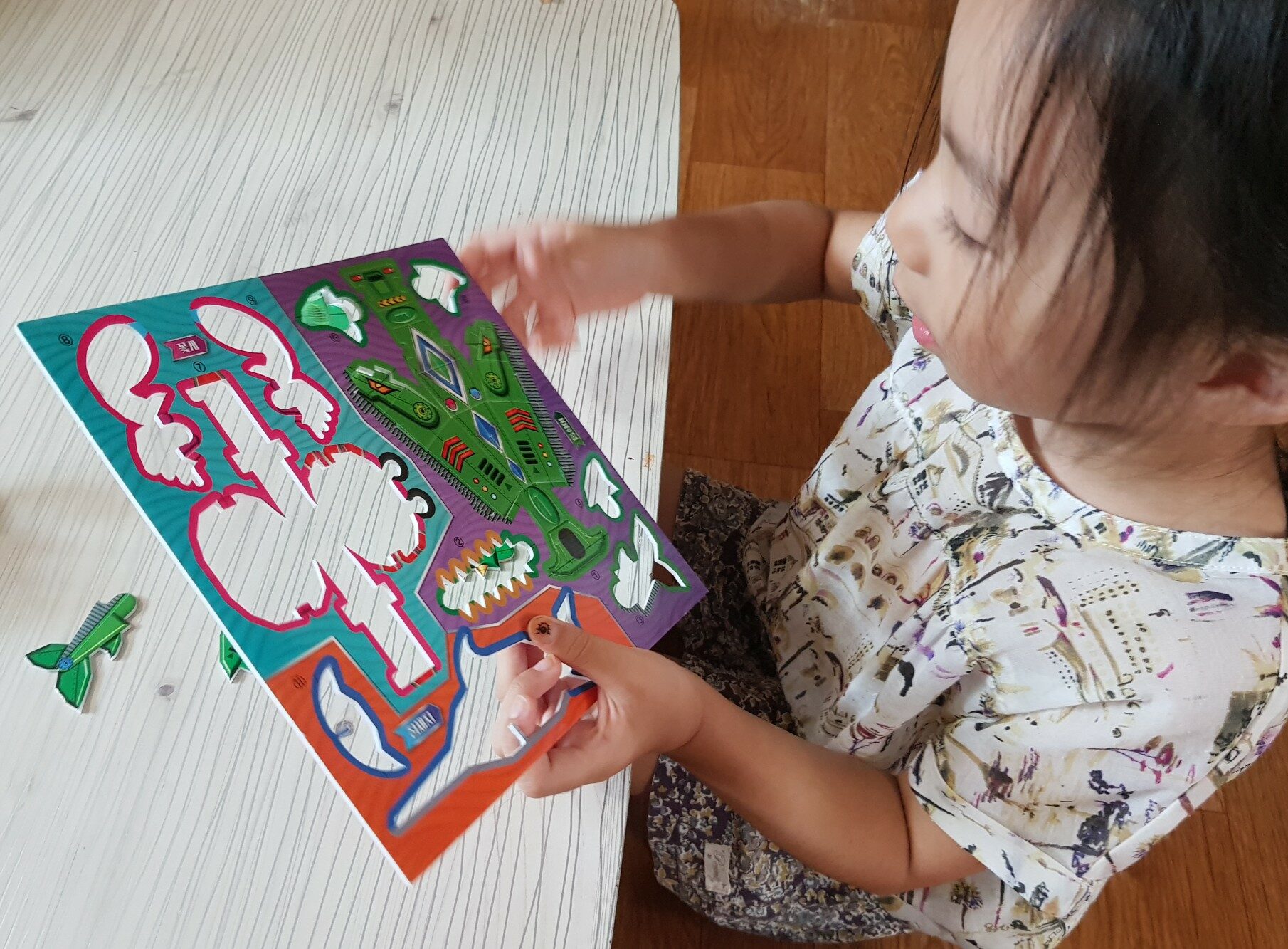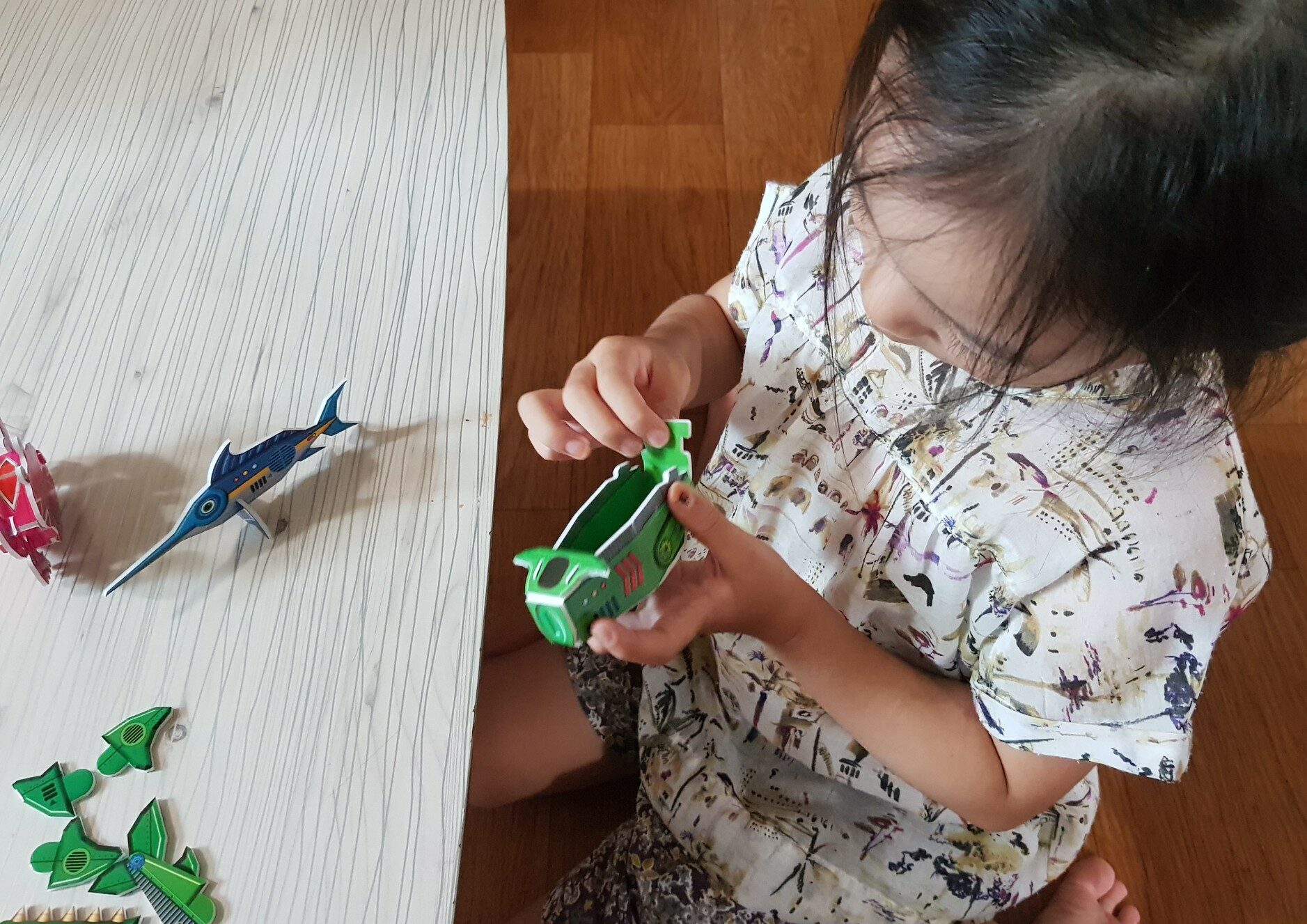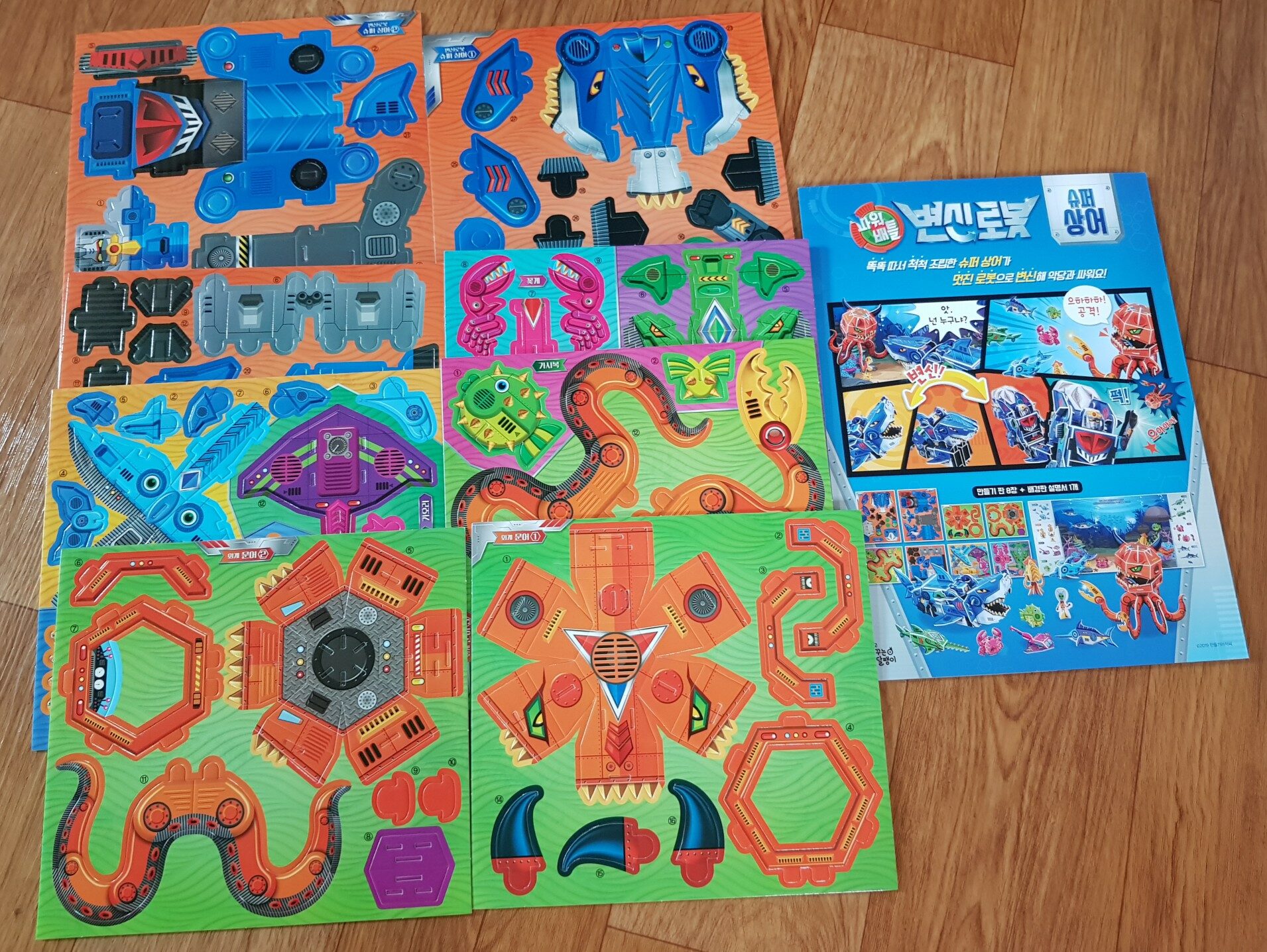 변신하는 슈퍼 상어와 움직이는 외계 문어가 싸우면 누가 이길까? 똑똑 소리가 나게 만들기 판에서 조각을 뜯어내서 척척 조립하면 바닷속 동물 로봇이 만들어 진다. 만들기를 좋아하는 우리 딸. 아직 어리지만 손이 야무져 언니를 따라 잘 만든다. 먼저 바닷속에는 무슨 동물들이 살고 있는지 물어 본다. 오징어 게 조개 등 알고 있는 동물들이 다 나온다. 구성은 만들기 판 8장과 배경판 설명서 1개이다. 만들고 싶은 로봇부터 선택해서 그 로봇을 종이판에서 분리하여 조립하면 끝! 먼저 오징어 부터 만들어 본다. 너무 쉽다. 3개의 조각을 뜯어 내어 조각들을 구부리고 맞추면 멋진 오징어 로봇이 완성된다. 그 다음은 초록색 톱상어를 만들고 싶다는 우리 딸. 부리가 톱인게 무섭게 생겼다고 말하지만 만들기에 자신감이 생겨 엄마의 도움 없이도 스스로 잘 만든다. 이번에는 하이라이트 외계문어와 변신로봇 슈퍼 상어 만들 차례. 엄마가 나섰다. 엄마의 실력을 보여 주니 아이들이 신났다. 드디어 모든 로봇 완성! 천천히 시간을 두고 만들고 싶었는데 욕심많은 막내덕분에 하루만에 모든 로봇이 완성 되었다. 짜잔~~ 외계인을 품은 문어가 너무 신기했다. 변신 로봇 슈퍼 상어는 만드는데 시간이 제법 걸렸다. 다 만들고 나니 엄마가 뿌듯했다. 아이들과 주말 오후 시간 가는줄 모르고 집중하면서 만들었다. 아이들의 집중력과 상상력을 키워주는 변신로봇 슈퍼 상어 덩달아 엄마도 행복했다.